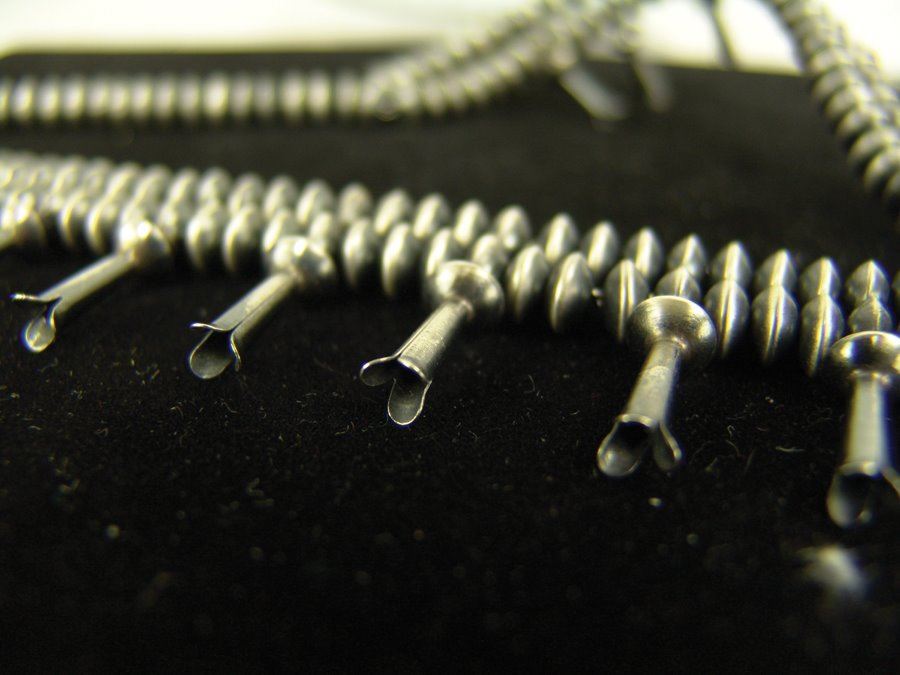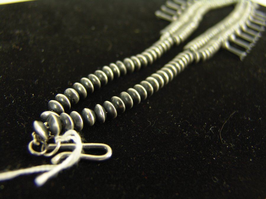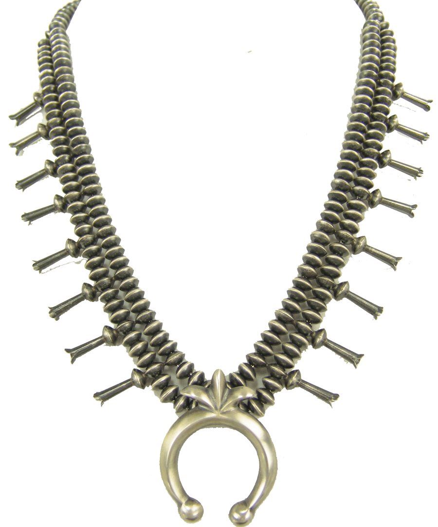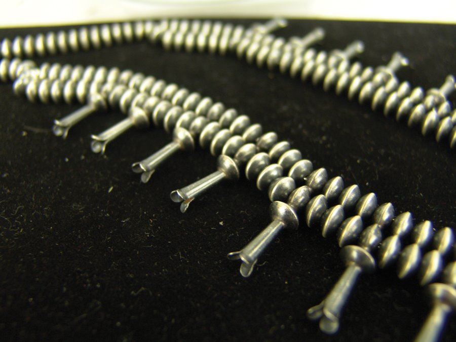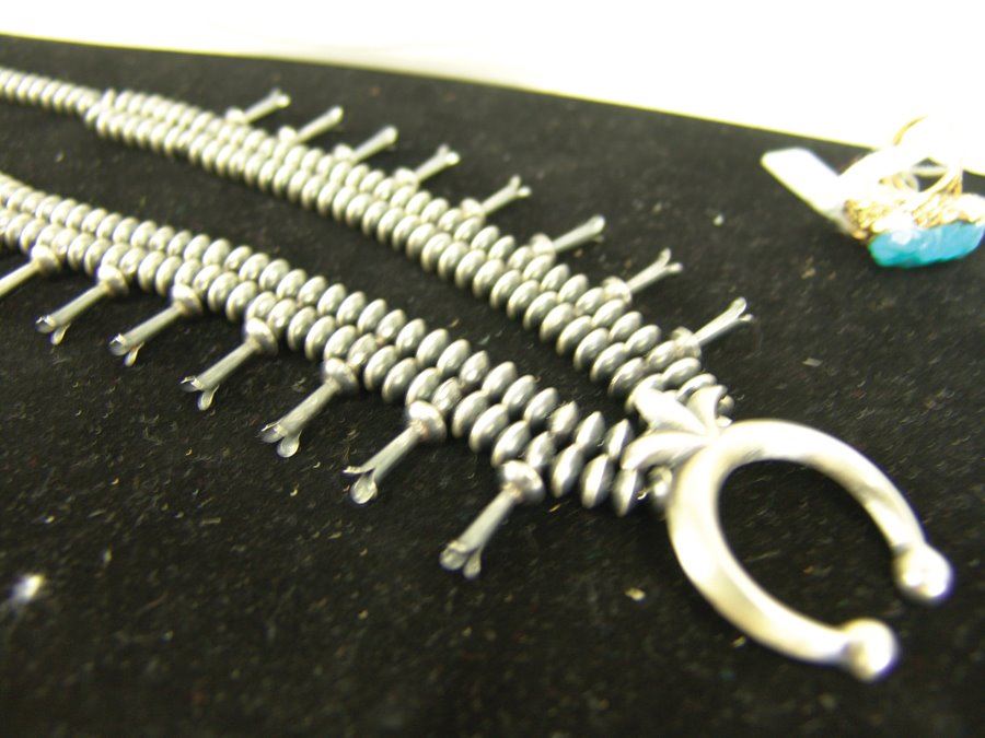 Very fine, petite sized all silver squash blossom necklace with tiny pinched bench made beads, long graceful blossoms, and small sandcast horseshoe naja. Very good condition, very fine.,Late 1900s,24"