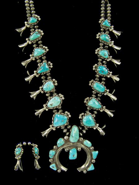 Circa 1970s, Classic design all silver "squash blossom" necklace with matching earrings set with 24 beautiful matching turquoise stones. Very good condtion. 28" long, 2-3/4" x 2-3/4" naja