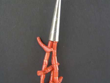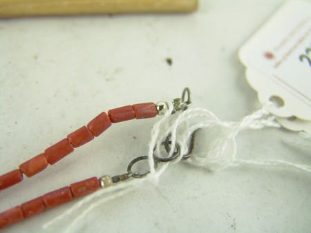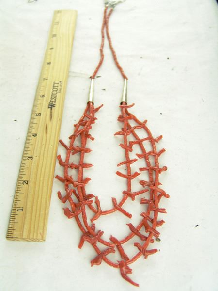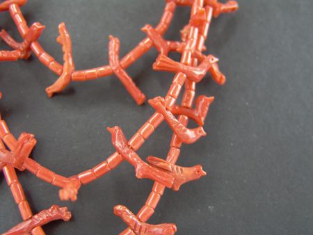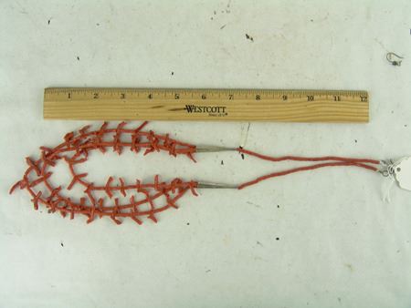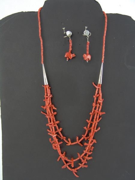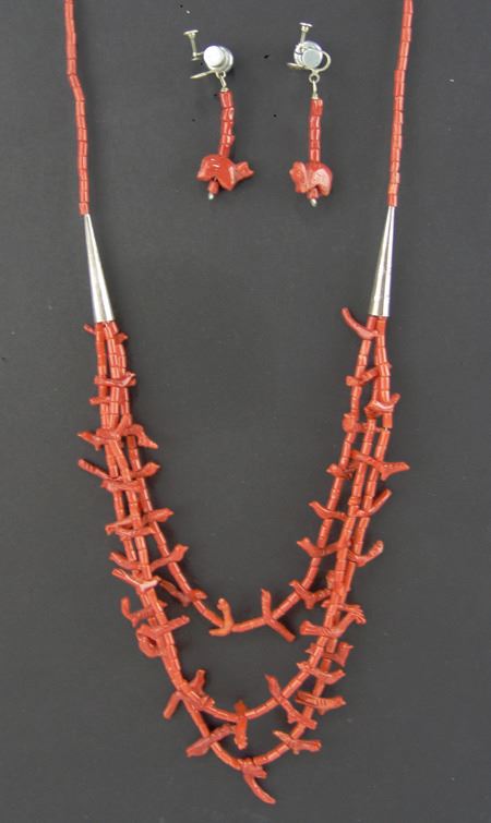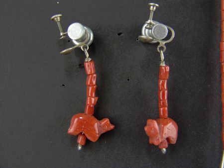 Ca. 1970s, Beautiful finely carved red branch coral bird fetish necklace on matching beads and with matching bear figure earrings. Very good condition. 27" long, earrings 2"