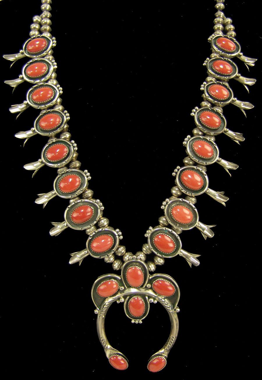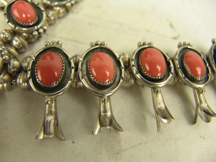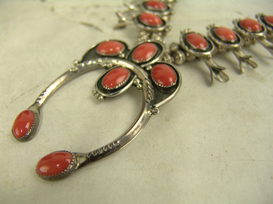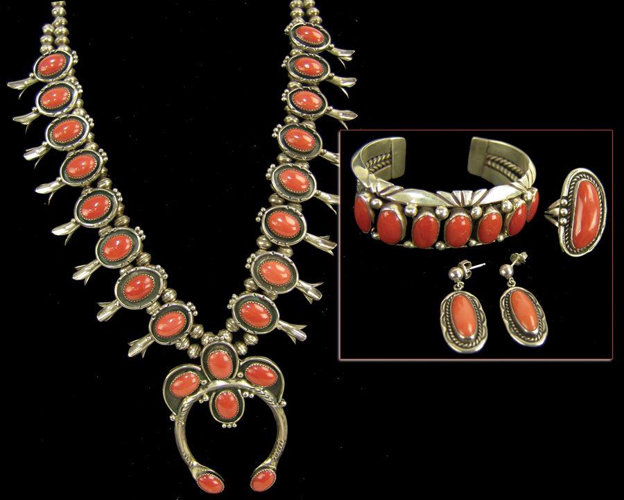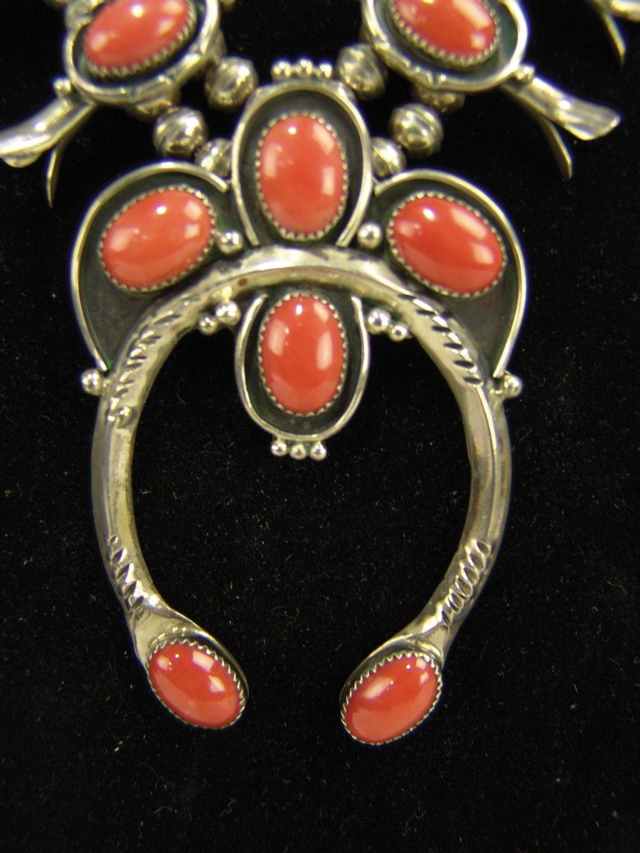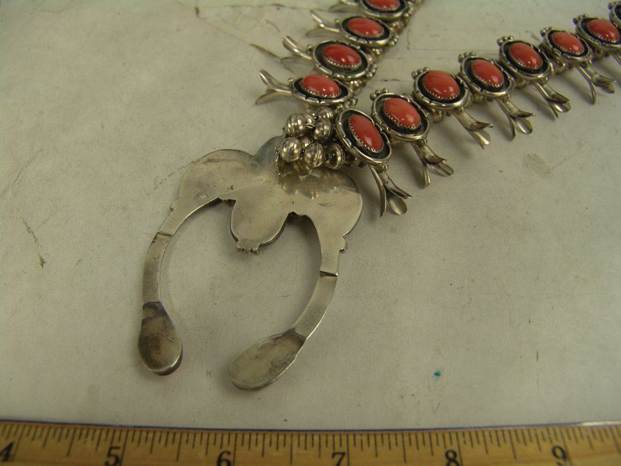 Exceptional hand wrought 25" all silver squash blossom necklace with unique elongated fancy horseshoe Naja plus matching earrings, size 7 ring and bracelet. All with beautiful matching deep Salmon red oval Coral stones.,,Brac. 5-1/2" x 1" x 7/8"