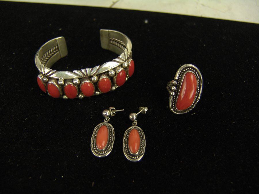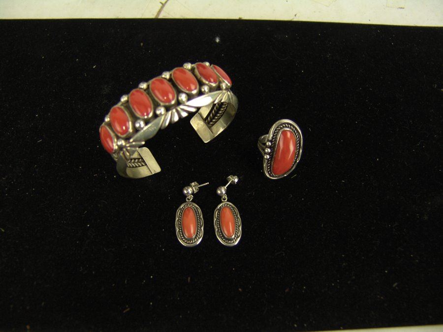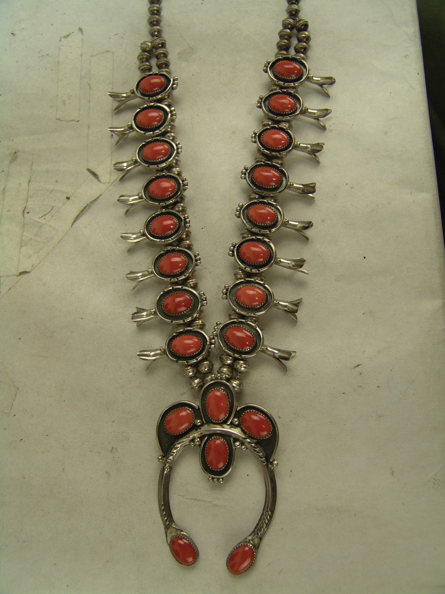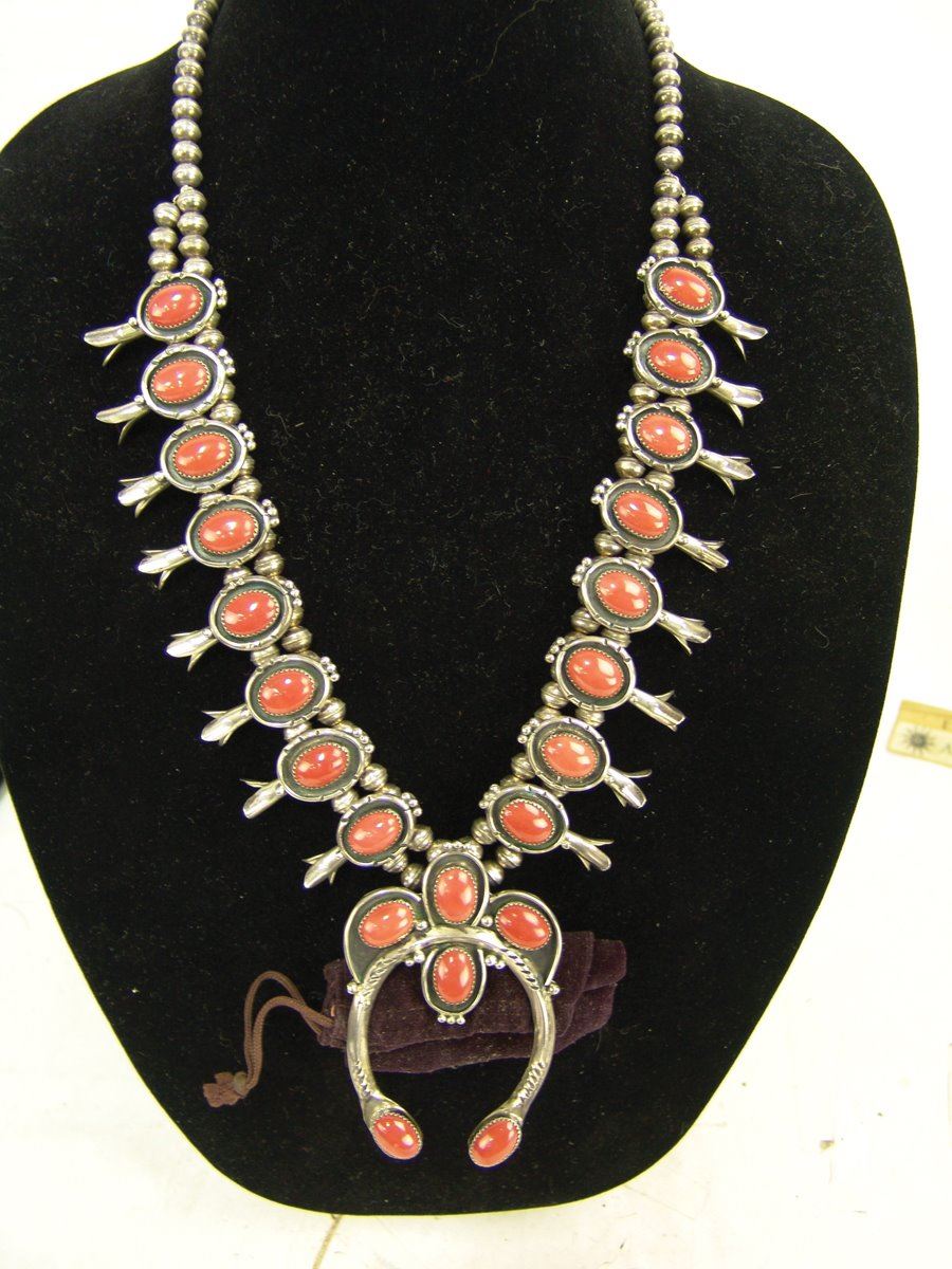 Exceptional hand wrought 25" all silver squash blossom necklace with unique elongated fancy horseshoe Naja plus matching earrings, size 7 ring and bracelet. All with beautiful matching deep Salmon red oval Coral stones.,,Brac. 5-1/2" x 1" x 7/8"