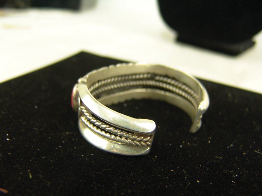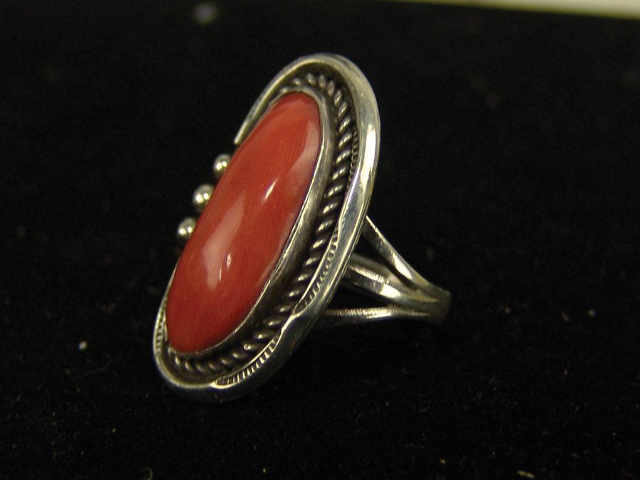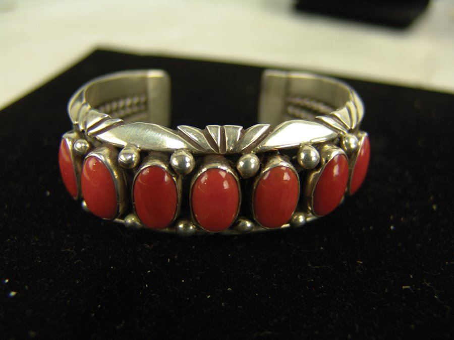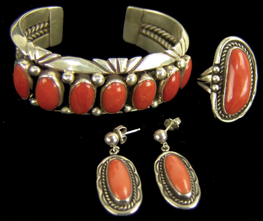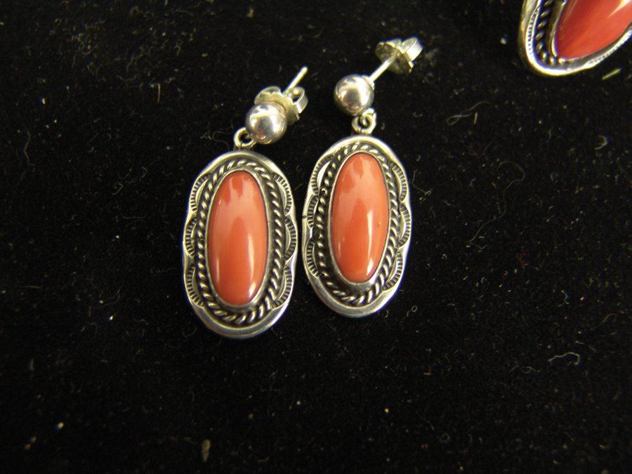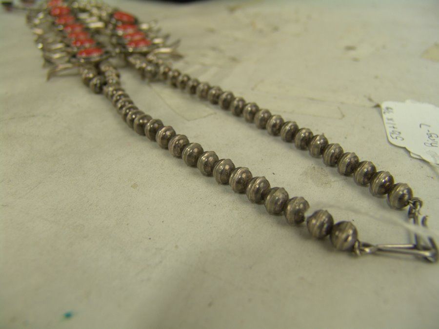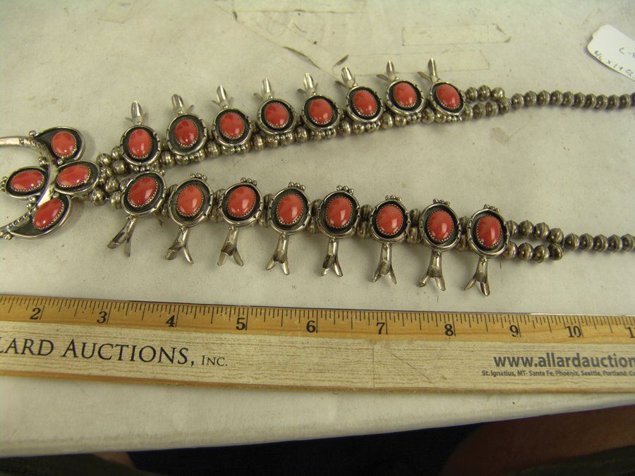 Exceptional hand wrought 25" all silver squash blossom necklace with unique elongated fancy horseshoe Naja plus matching earrings, size 7 ring and bracelet. All with beautiful matching deep Salmon red oval Coral stones.,,Brac. 5-1/2" x 1" x 7/8"