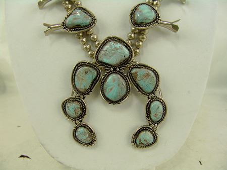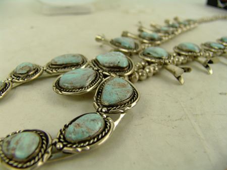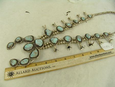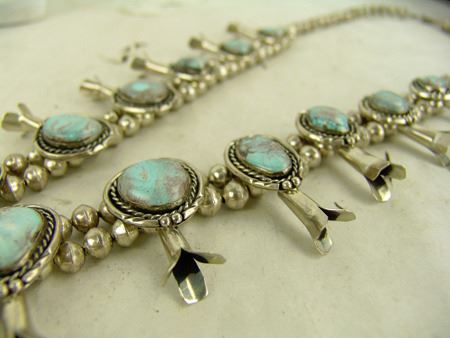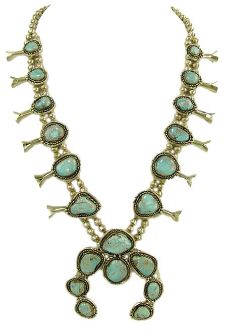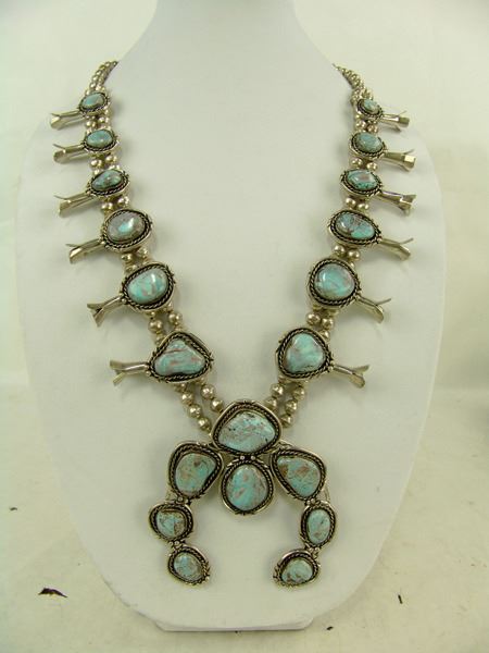 Ca. 1980s, Classic hand wrought all-silver squash blossom necklace, the 12 blossom segments and seven-stone naja all with matching light blue Nevada turquoise stones. Very good condition. Unsigned. 26" long, naja 4" x 3-1/2"