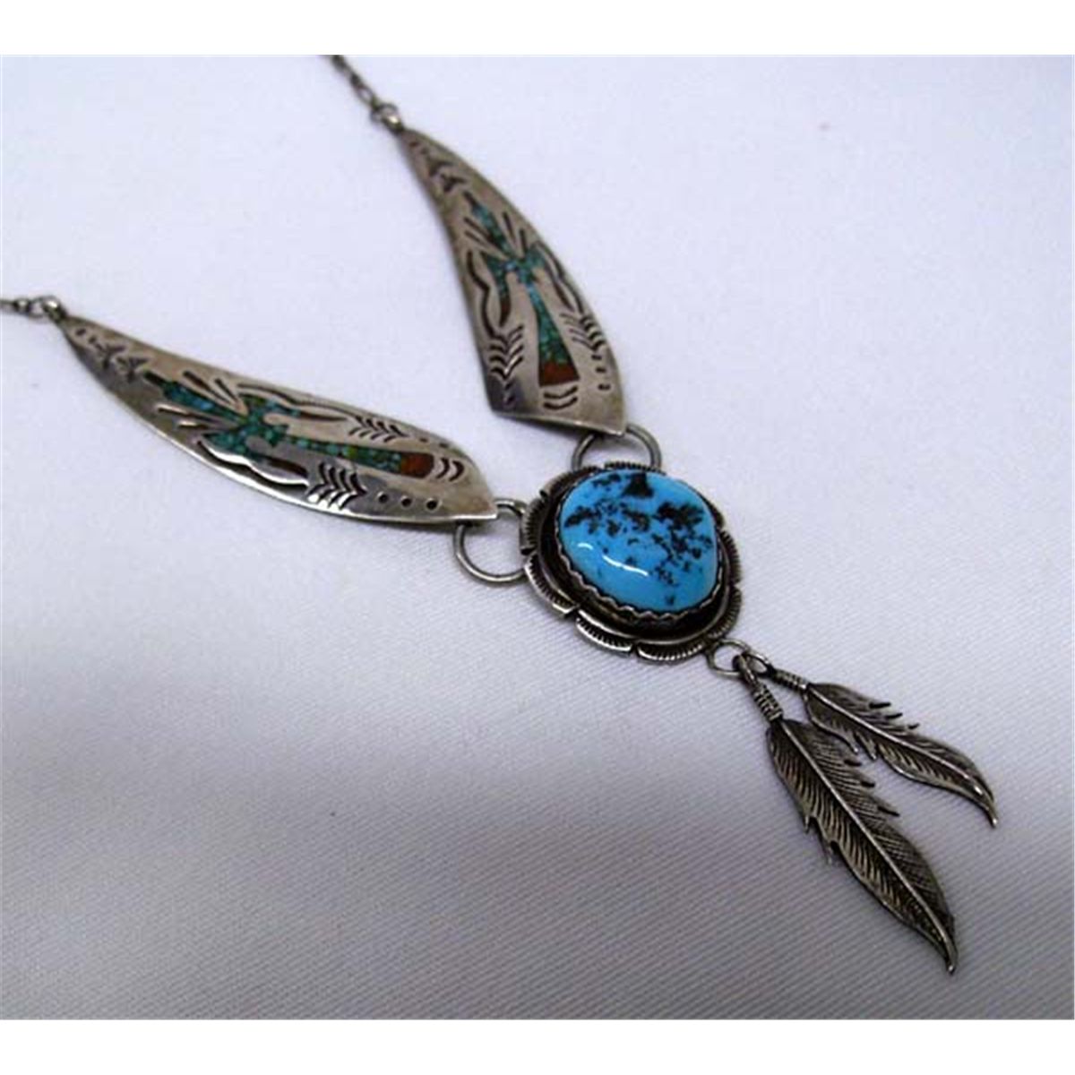 Native American Navajo Necklace with Turquoise Nugget Pendant. Necklace measures approx. 20'', pendant measures 2 3/4''. Necklace has 2 silver pieces with turquoise and coral chips with stamped work. Buyers Pay Actual Shipping and Handling Charges(see terms and conditions for more information).
