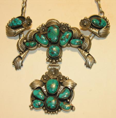 Circa Mid 1900s, All natural turquoise with beautifully developed matrix, set in heavy sterling with repousse' design. 16" long, 4-1/4" pendant