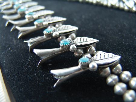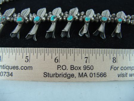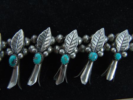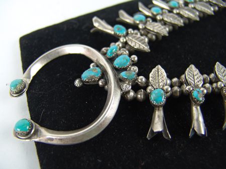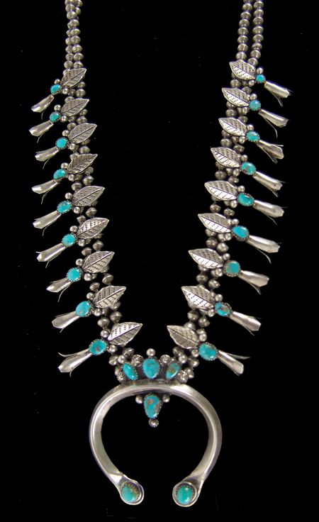 Ca. 1970s, Hand wrought original design all-silver squash blossom style necklace with unique leaf design segments and matching turquoise stones on the sandcast pendant. Very good condition, with nice patina. Necklace 27", Naja 2-3/4" x 2-1/2"