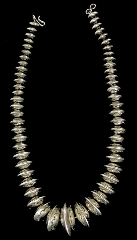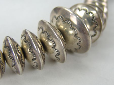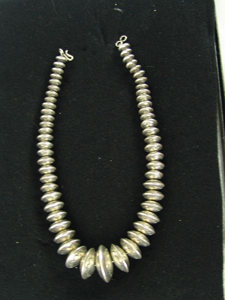 Late 1900s, Exceptional graduated strand of fine bench made all-silver beads, done with expert craftsmanship. Excellent condition, signed "LP" on the top bead. 17"