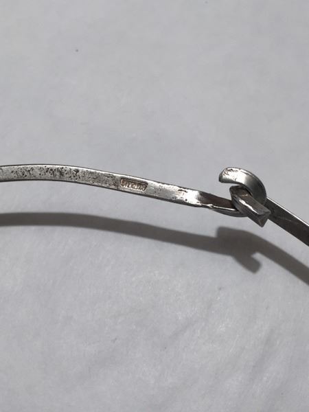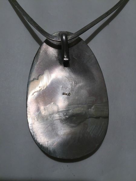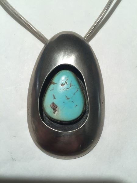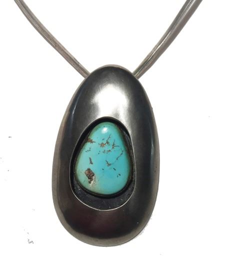Late 1900s, Great sterling choker with triangular natural Nevada turquoise cabochon in sterling shadowbox setting. 17", pendant 2-1/2" x 1-1/2"