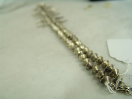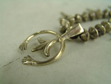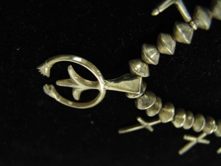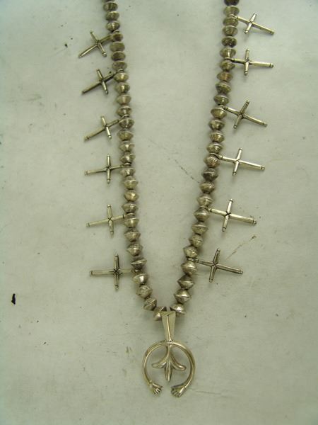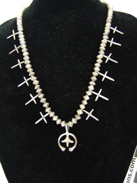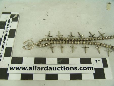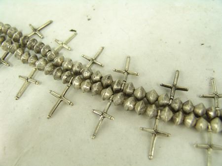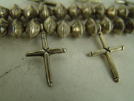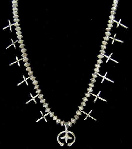 Ca. 1990s, Wonderful hand wrought all-silver necklace with bench made beads, 12 small crosses, and small sand cast friendship hands naja. This is also attributed to Marcella James. Very good condition. 26" plus pendant