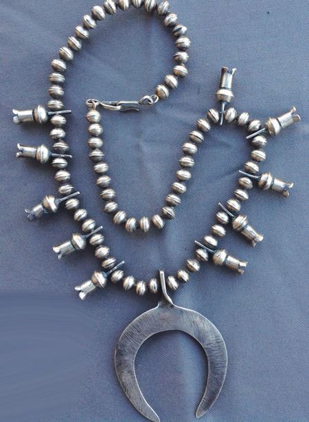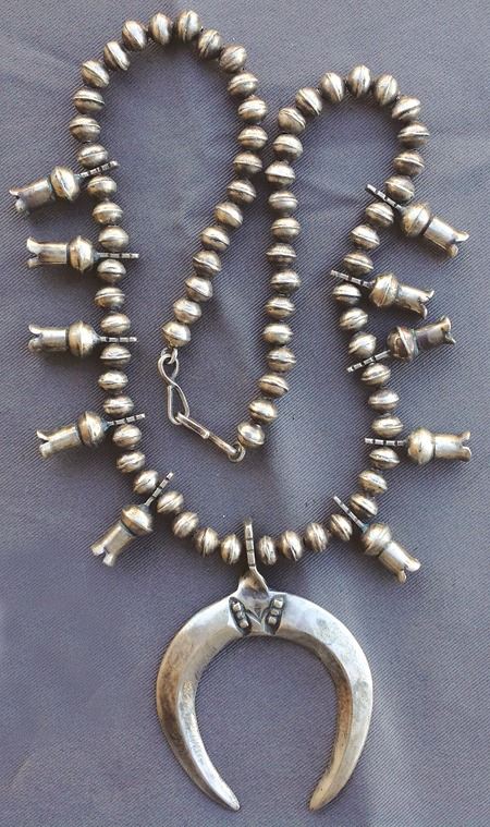 Mid 1900s, Vintage all-silver squash blossom necklace with old-style sand cast naja all done on bench made beads. Very good condition. 22" long