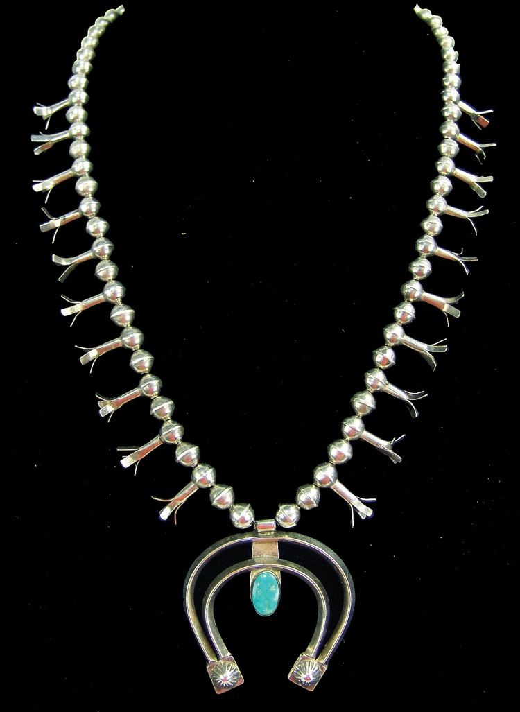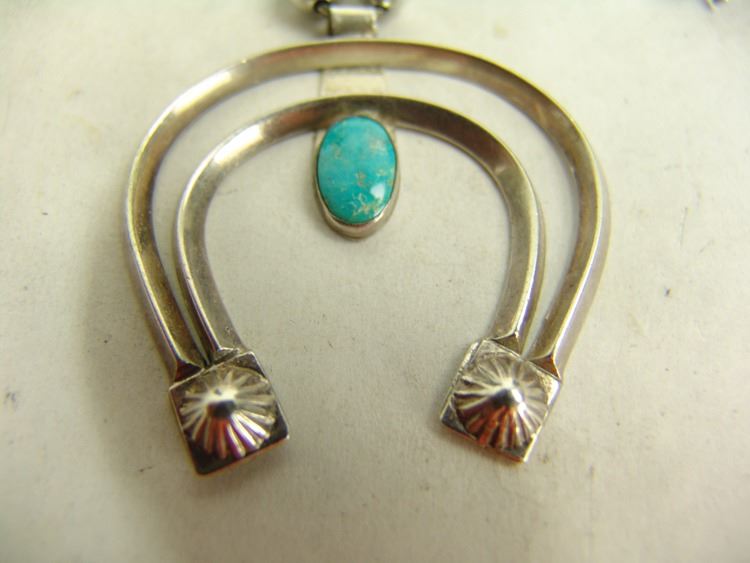Petite all silver squash blossom necklace with 20 side blossoms and classic silver horseshoe naja with single Cerrillos turquoise stone. Very good condition. Unsigned.,Ca. 1980s,21"