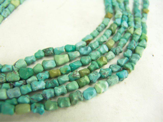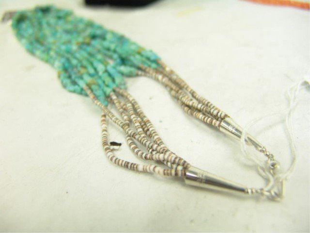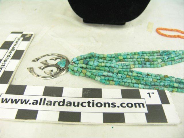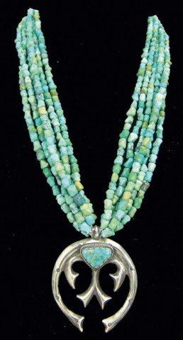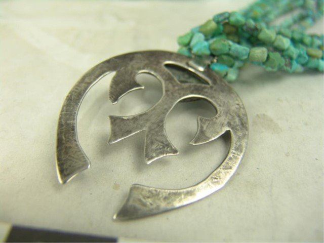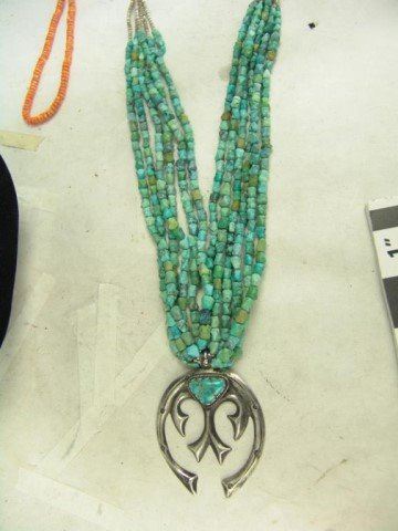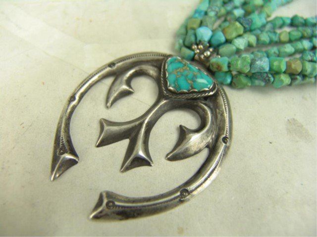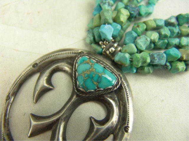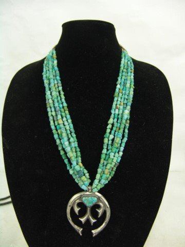 Mid/Late 1900s Wonderful vintage six-strand shell heshi and turquoise nugget necklace with an early sand cast all silver naja that contains another single Morenci turquoise stone. Very good condition. Nice patina. 24"