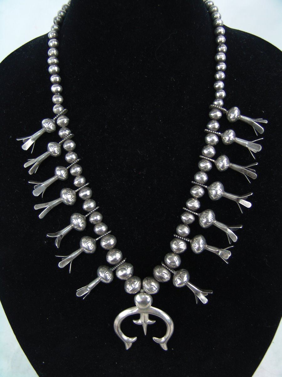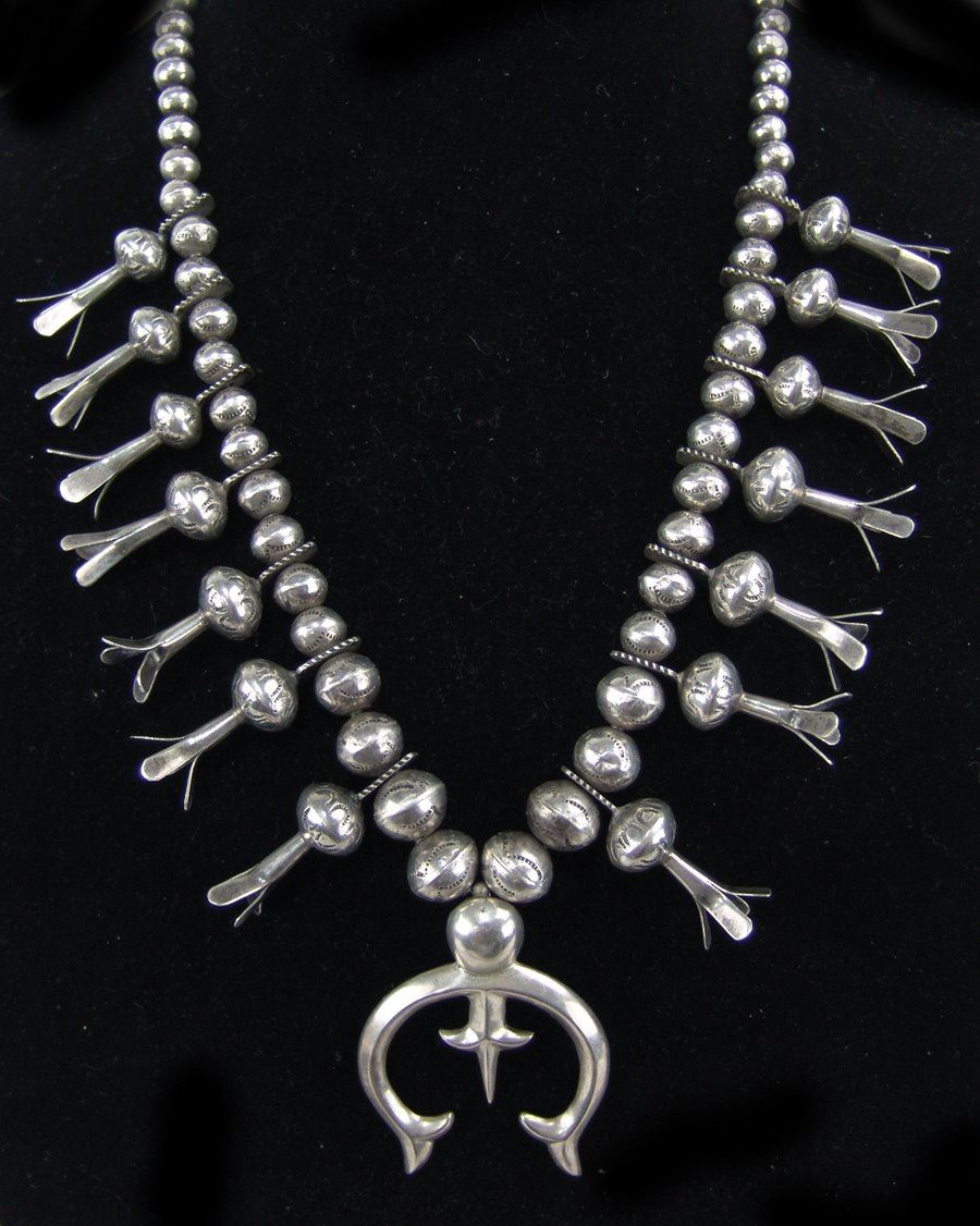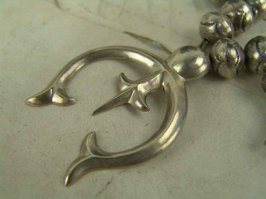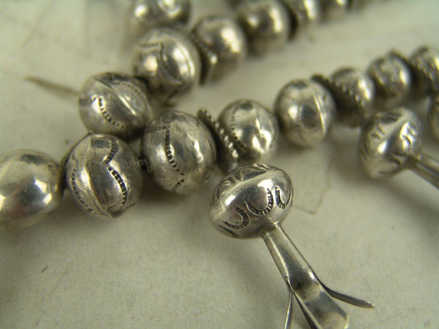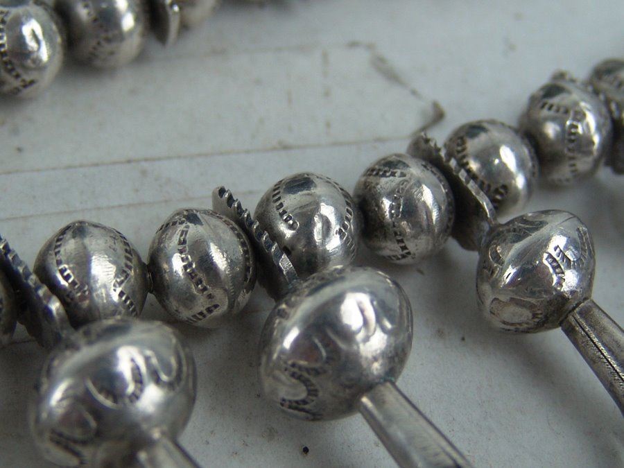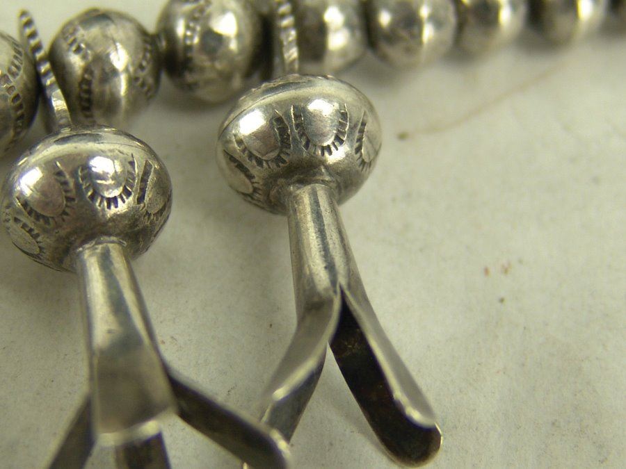 Very fine, all silver squash blossom necklace with traditional sand cast naja and 14 blossom segments, all strung on beautiful, graduated hand-stamped bench made beads. Very good condition, unsigned.,Mid/Late 1900s,22"