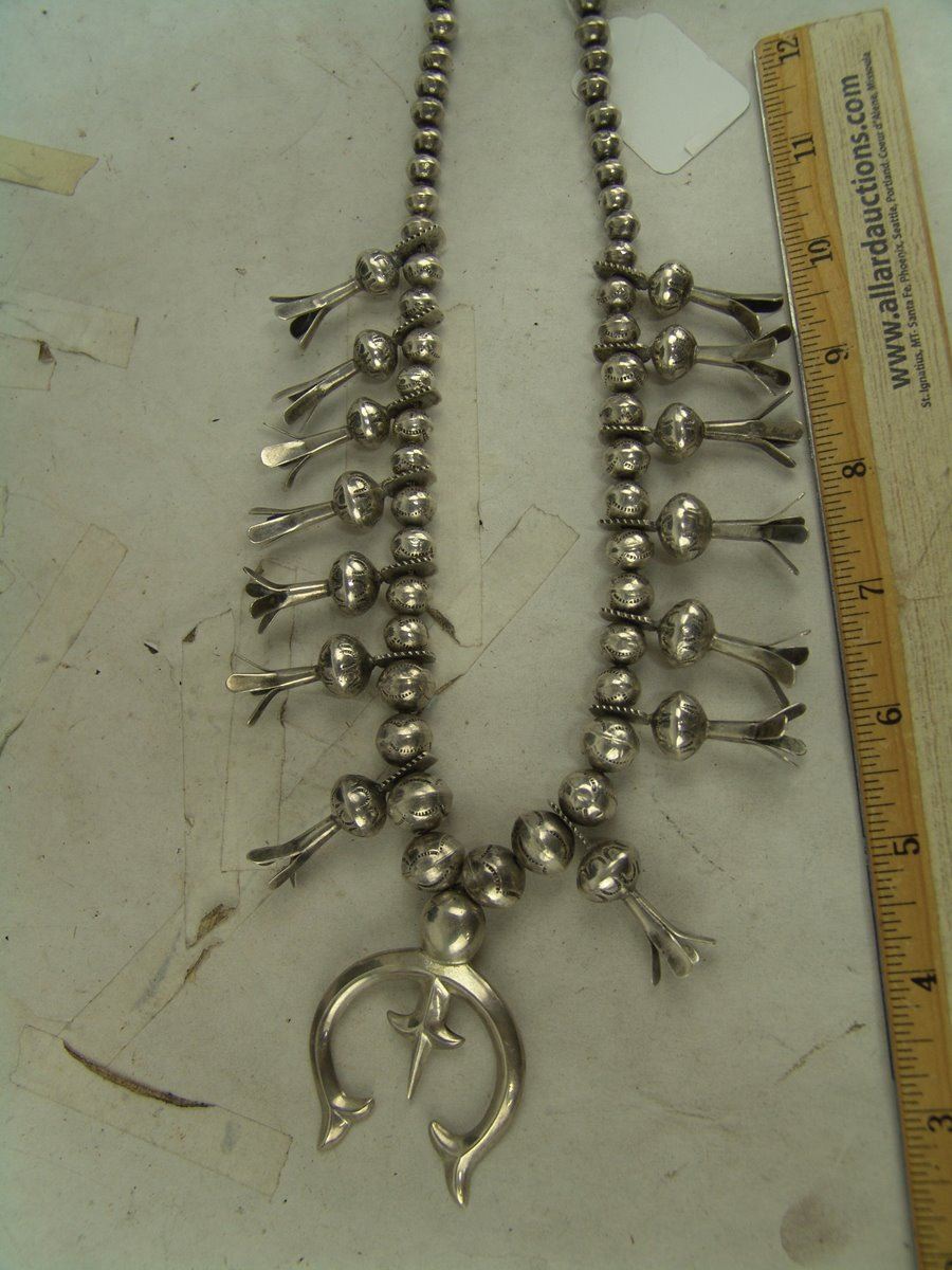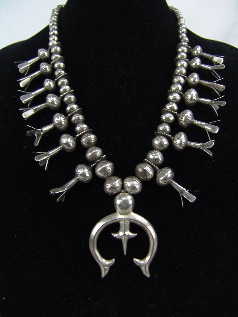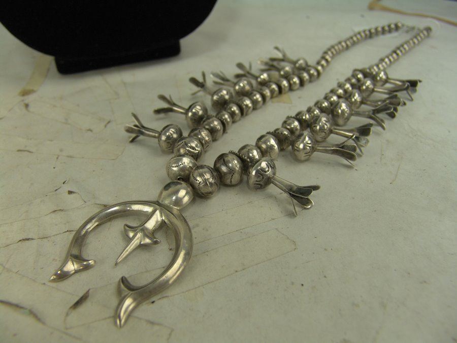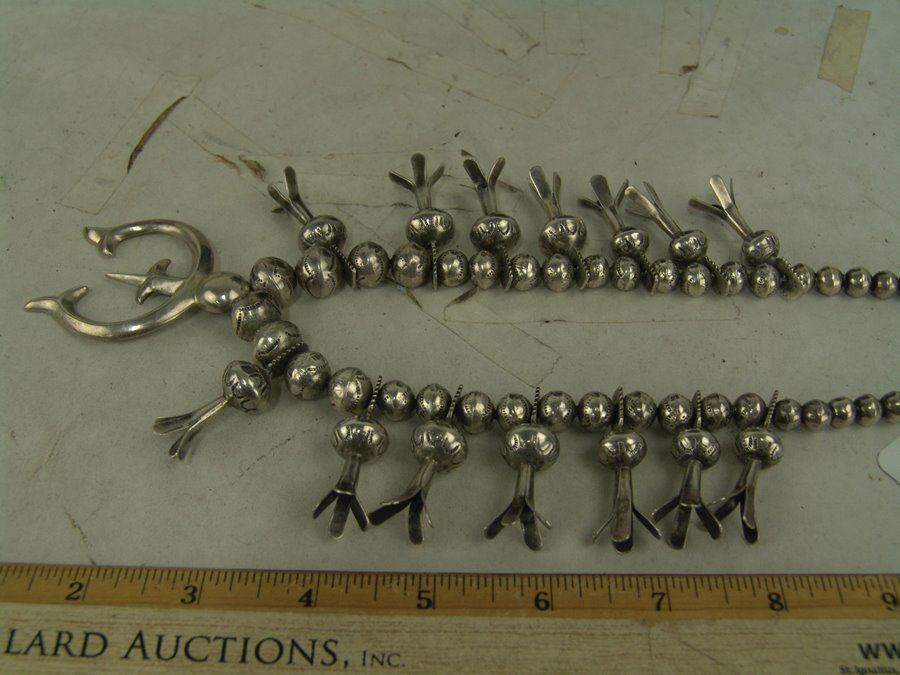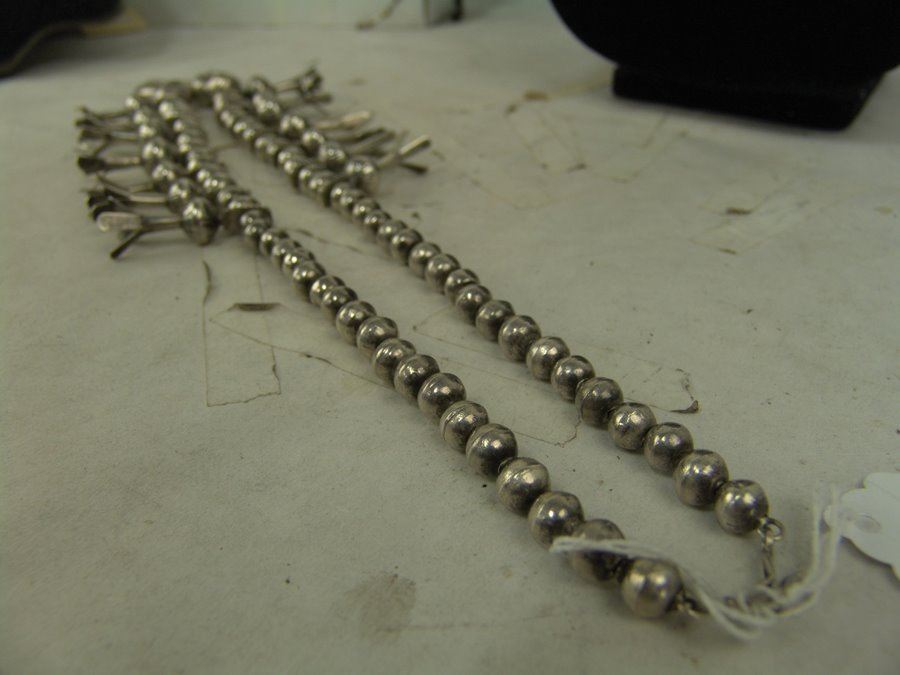 Very fine, all silver squash blossom necklace with traditional sand cast naja and 14 blossom segments, all strung on beautiful, graduated hand-stamped bench made beads. Very good condition, unsigned.,Mid/Late 1900s,22"