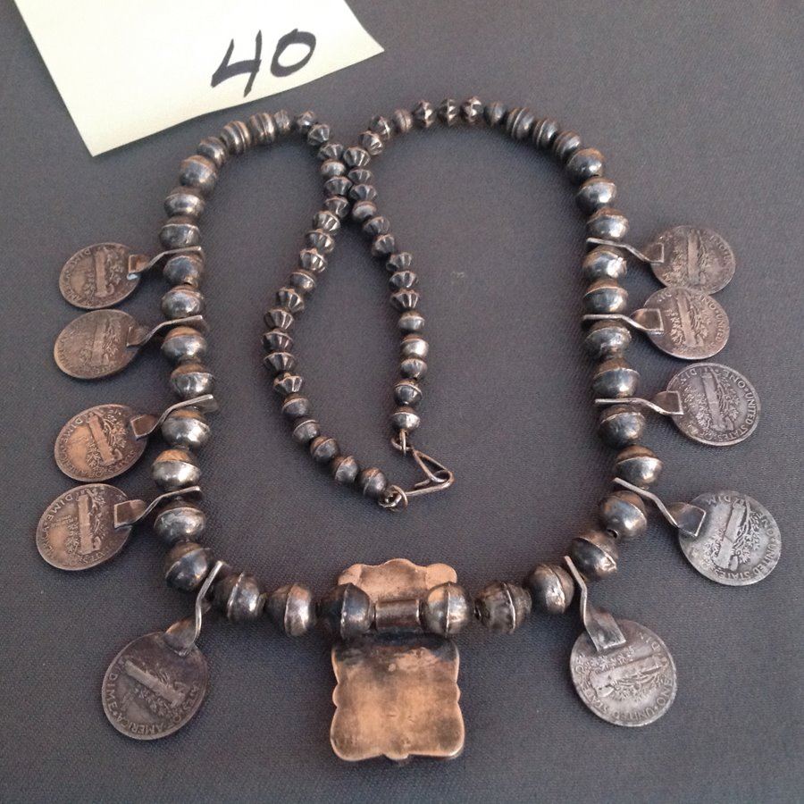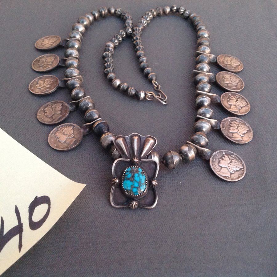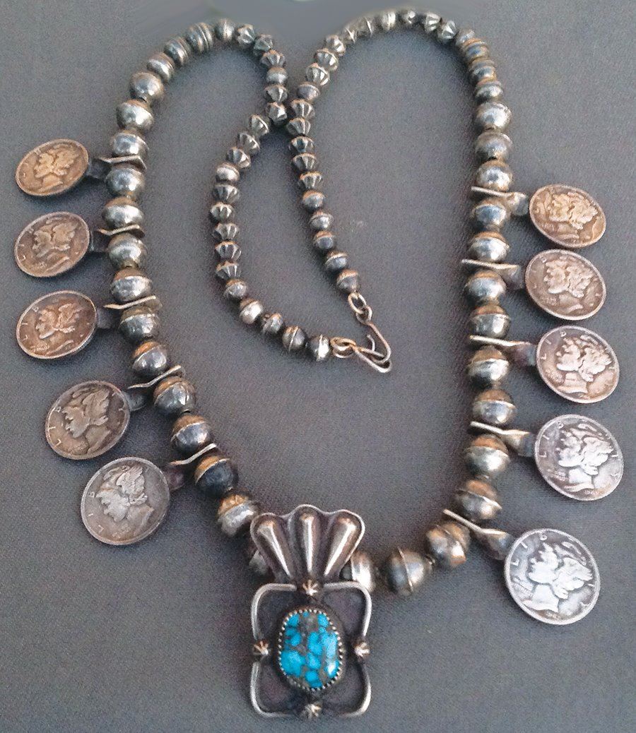 Unique all silver necklace done in modified squash blossom design featuring U.S. Mercury dimes and with a repousse' pendant holding a single turquoise stone. Very good condition.,Ca. 1950s-1970s,22" L