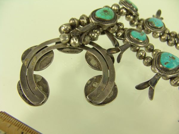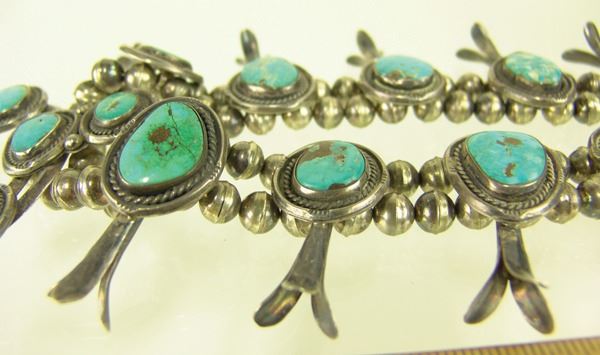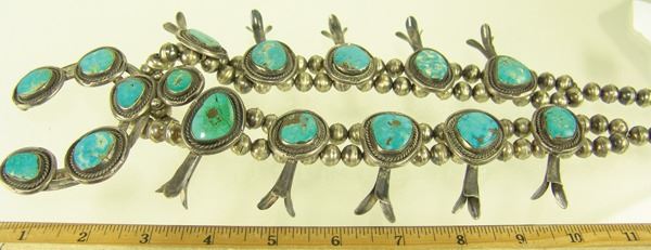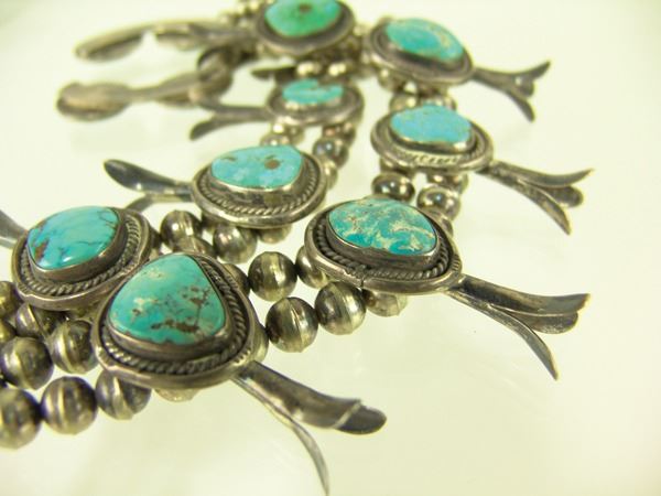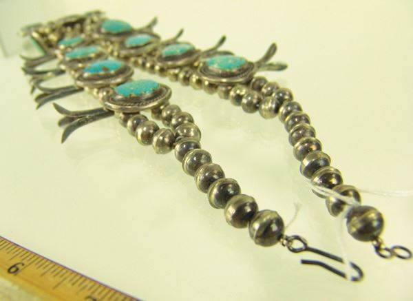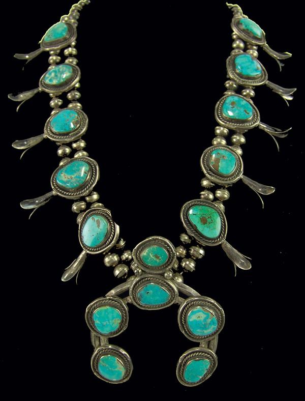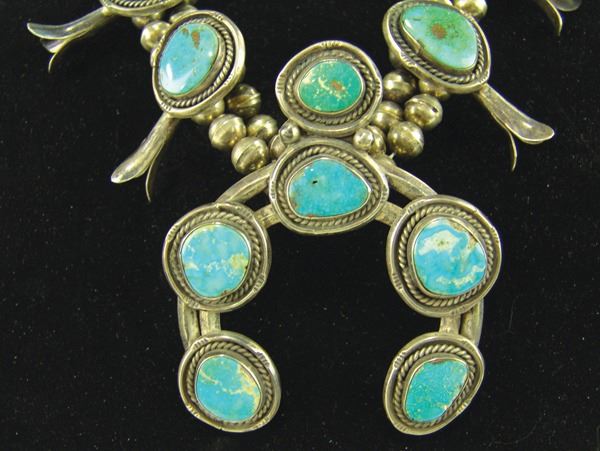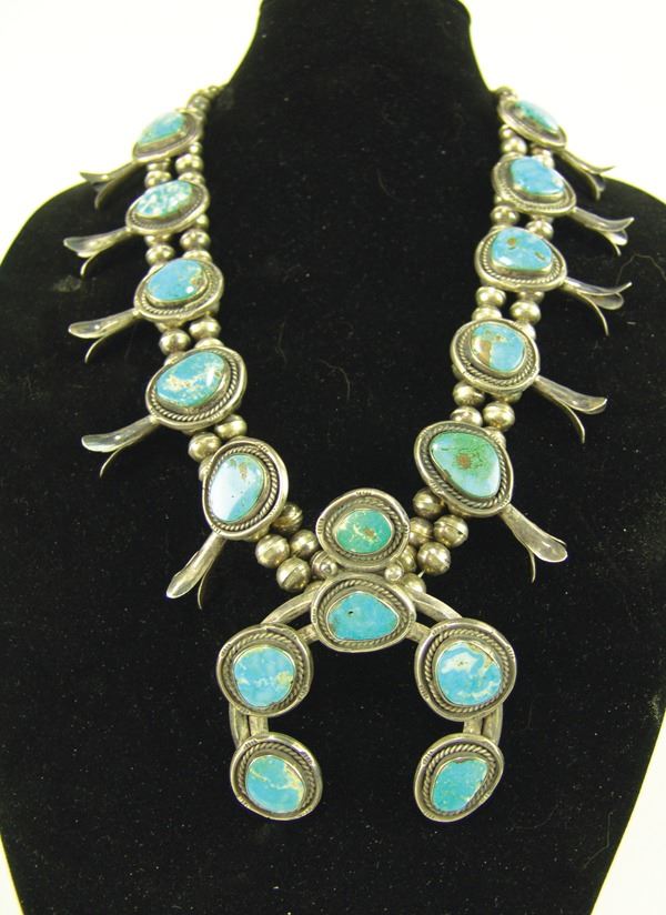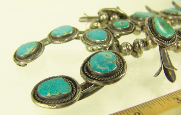 Classic design turquoise and silver squash blossom necklace with 3" naja and 11, naturally aged turquoise stones. Very good condition.Ca. 1970s