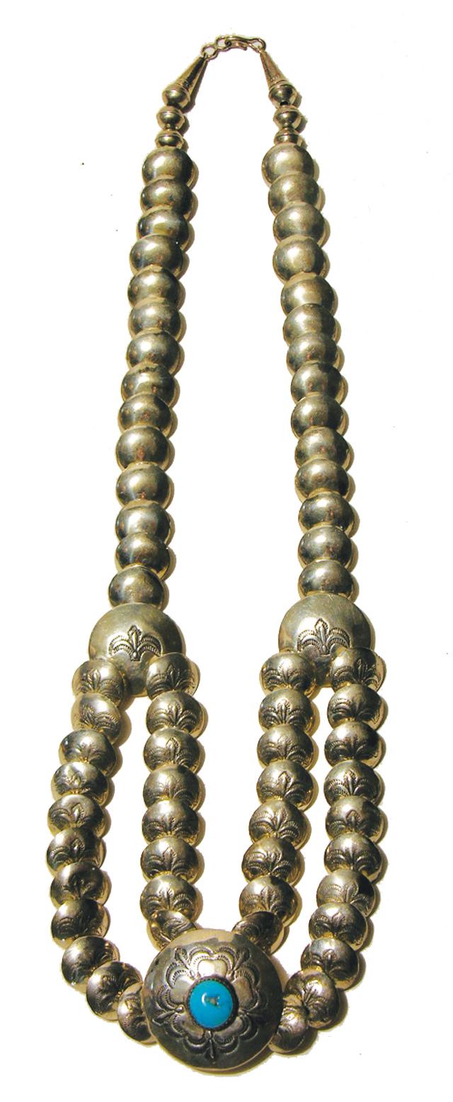 Circa 1970, Exquisite hand wrought sterling disc bead necklace with stamp work and central turquoise cabochon. 23"