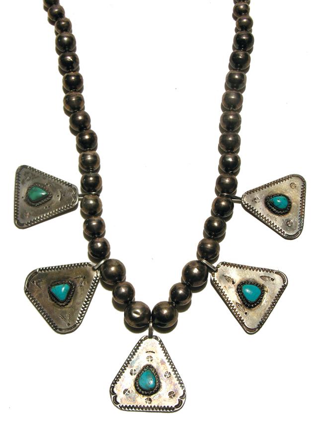 Circa 1930, Hand wrought silver bead necklace with five stamped triangular discs, each with a turquoise cabochon in the center. 26"