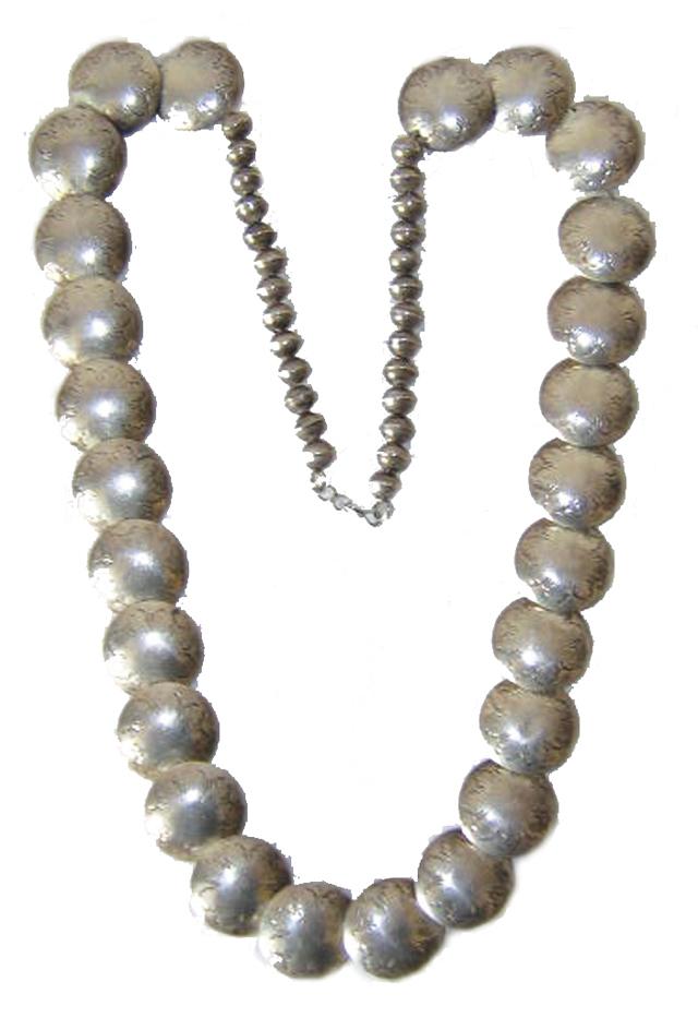 Circa 1980s, Sterling flat bead necklace with stamped designs. 29"