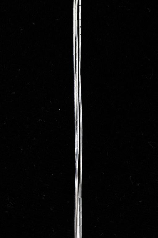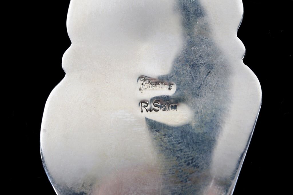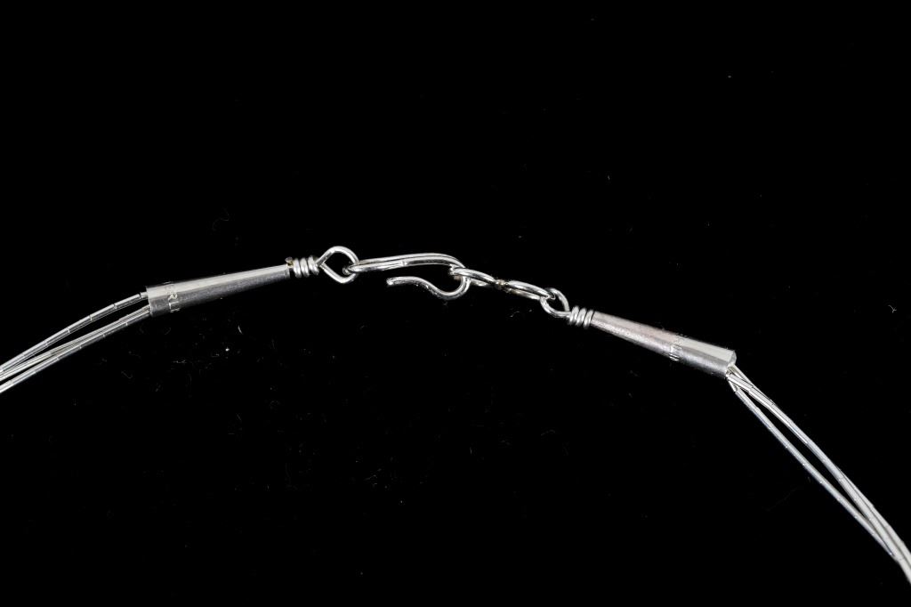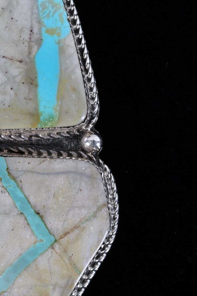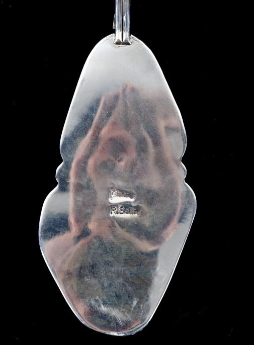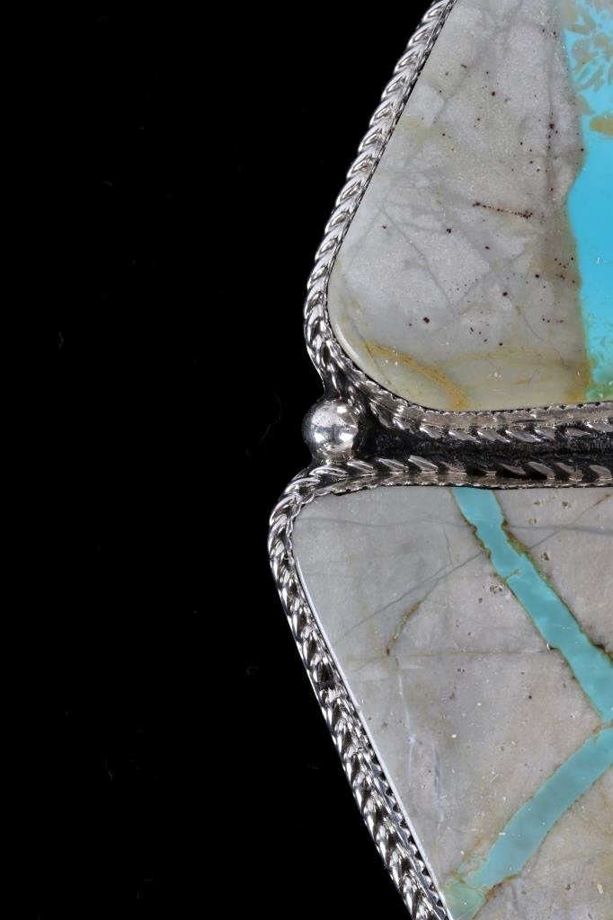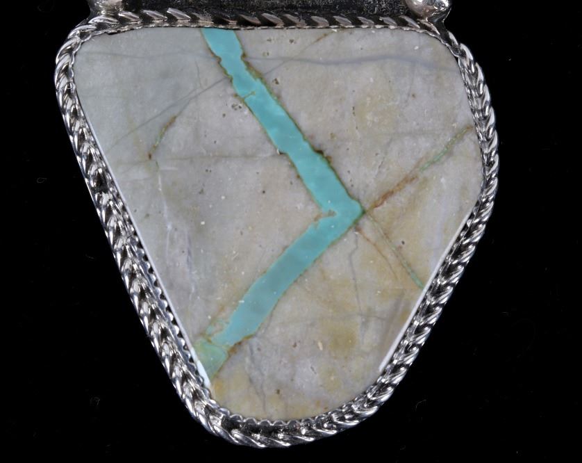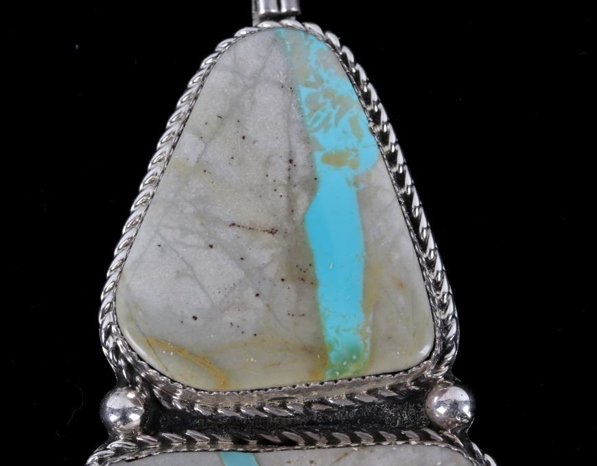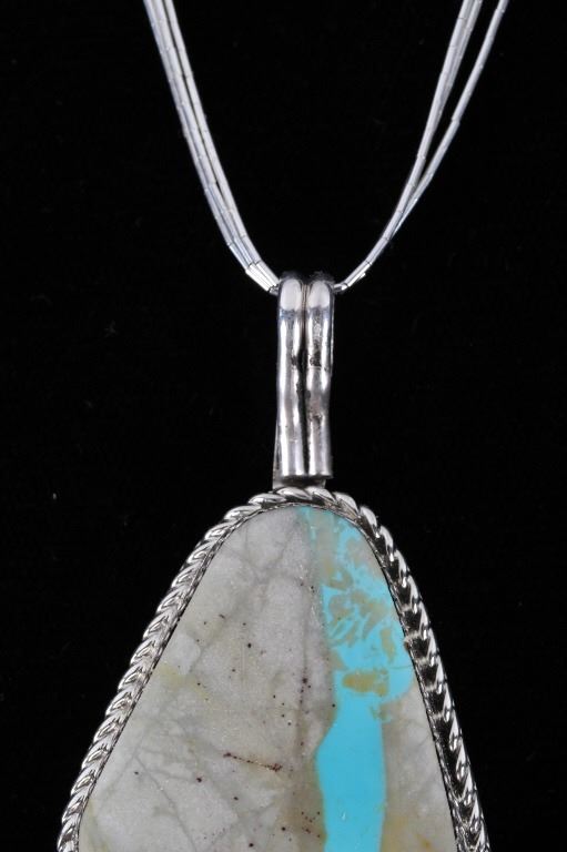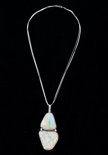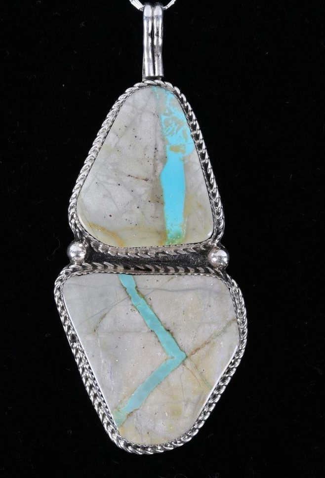 Featured in this lot is this Navajo Nevada Blue turquoise in agate sterling necklace done by renowned Navajo silversmith Russell Sam. This two piece pendant necklace shows a smaller and larger cabochon of agate with a thin vein of Nevada Blue turquoise in each. Both cabochons are set in sterling with a rope style border and two sterling beads in between them. The pendant is set on a three stand liquid sterling necklace. The back of the pendant shows the makers hallmark and the sterling stamp reading, "Sterling R. Sam". The necklace is in good condition with no signs of damage present. The larger cabochon measures 1 3/8" L x 1 7/16" W, while the smaller one measures 1 1/4" L x 1 2/16" W. The necklace from clasp to clasp measures 21 1/4" L. The necklace weighs 44.5 grams.