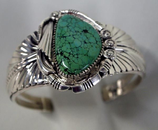 Native American Navajo Sterling Silver Nevada Green Turquoise Bracelet - Charloston Draper. Measures including the opening approx. 6 1/2'' x 1 3/4''W. Gorgeous bracelet with lovely green turquoise cabochon with lots of matrix.