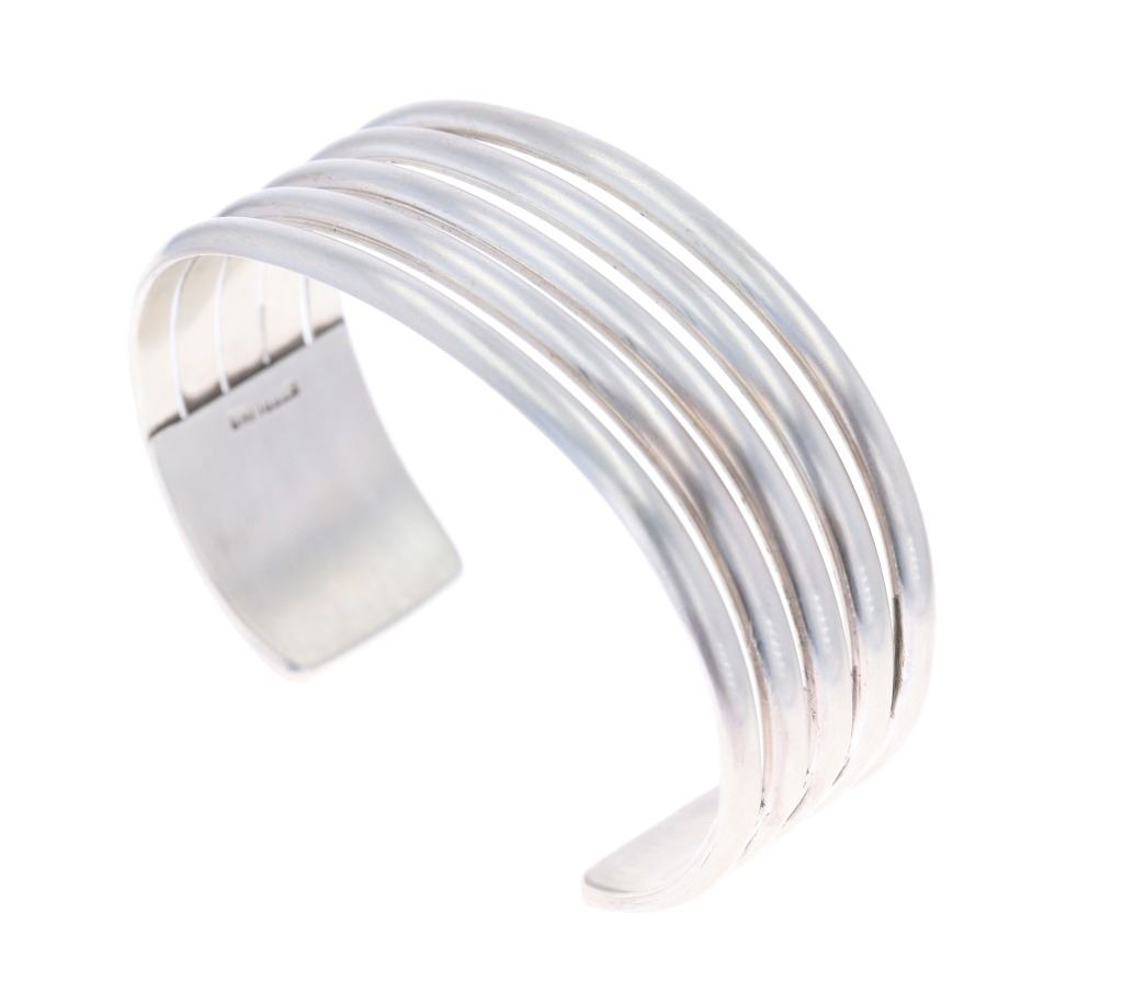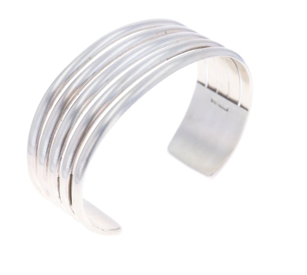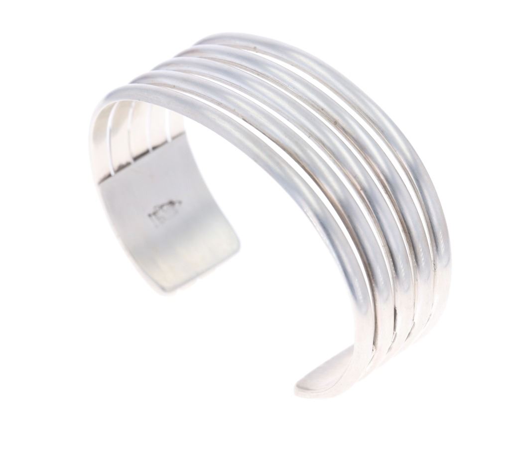 For your consideration is this five bar sterling cuff bracelet made by Navajo silversmith Nora Tahe. This bracelet features a five bar sterling design with the artist's hallmarks on the inside of the bracelet reading, "FV Jr. Tahe" on one side and "Sterling" on the opposite side. The bracelet shows good condition and construction with no signs of damage or wear. The bracelet has an inside circumference of approximately 7". The bracelet weighs 52.9 grams.*