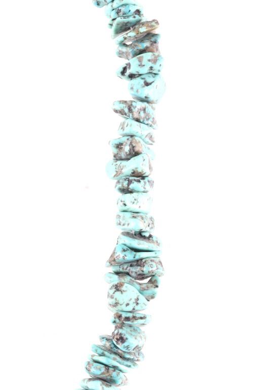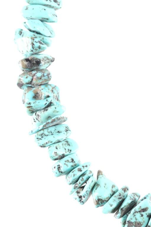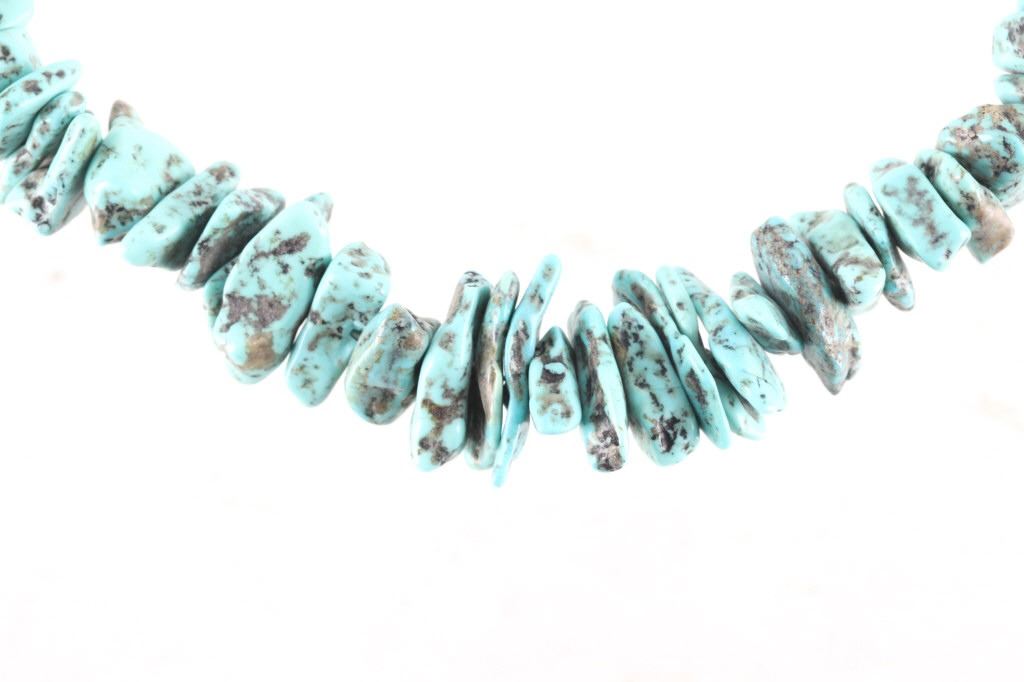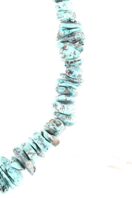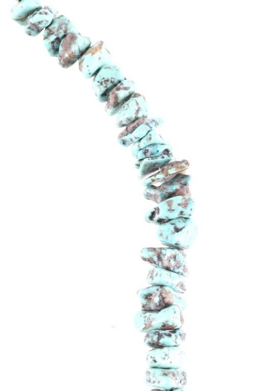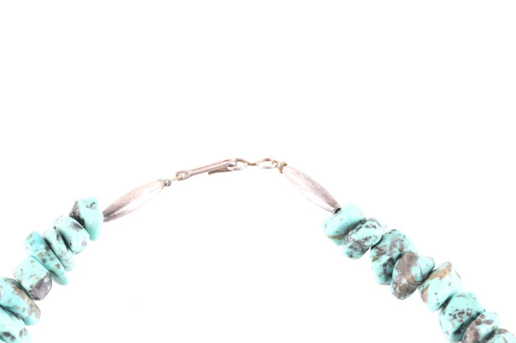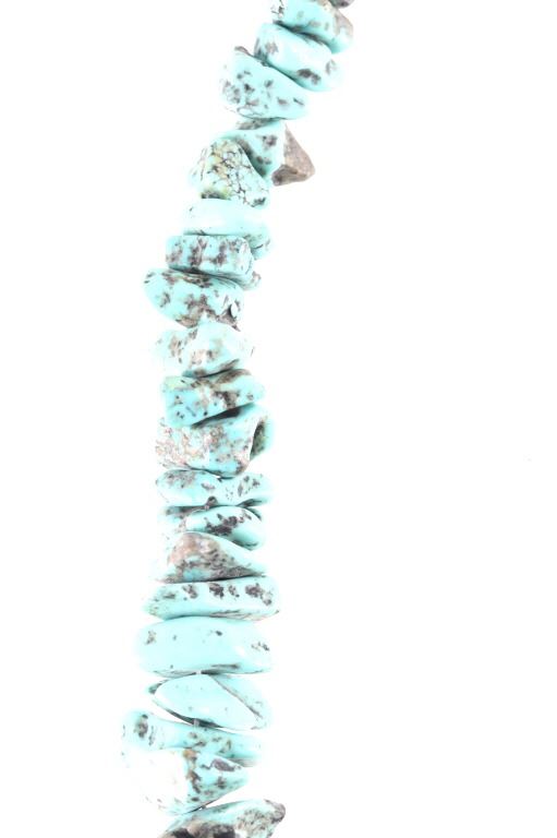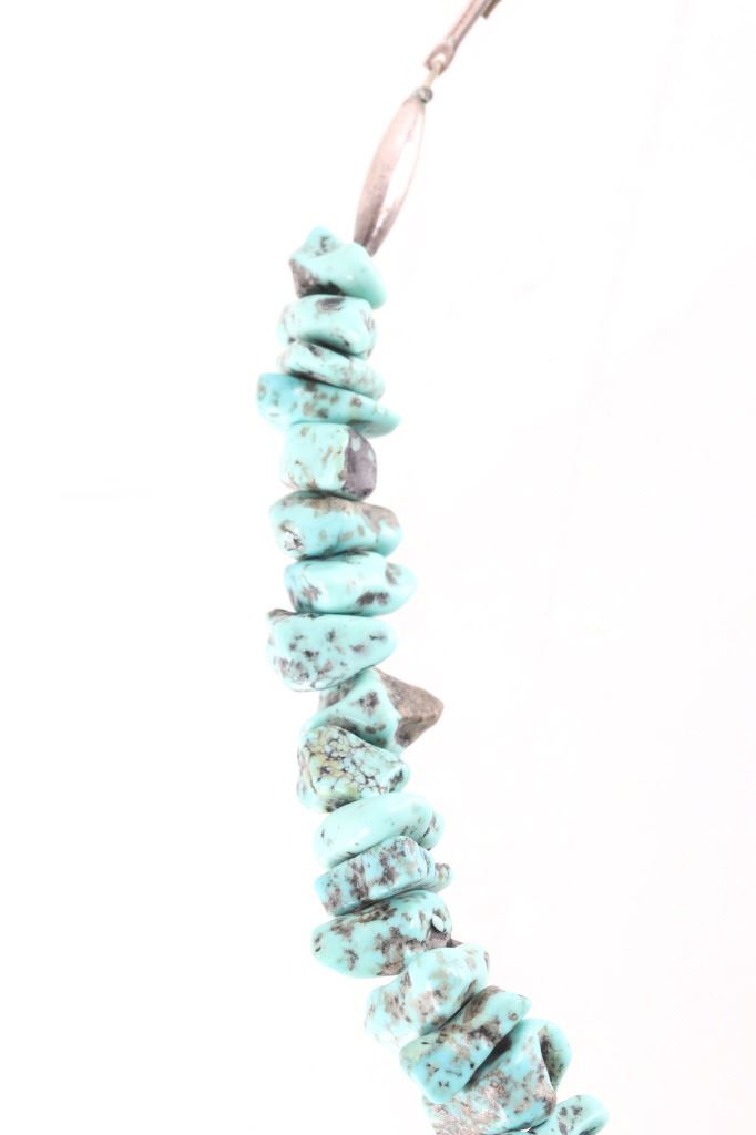 Featured in this lot is this Navajo nugget Kingman turquoise necklace circa 1940's. The necklace features a wonderfully and professionally crafted nugget Kingman turquoise cabochon set to a wire core and shows horizontally created silver beads. The condition of this of this nugget turquoise necklace is good with no obvious signs of damage and shows good overall condition. The measurements of this necklace from clasp to clasp is 23 1/2".