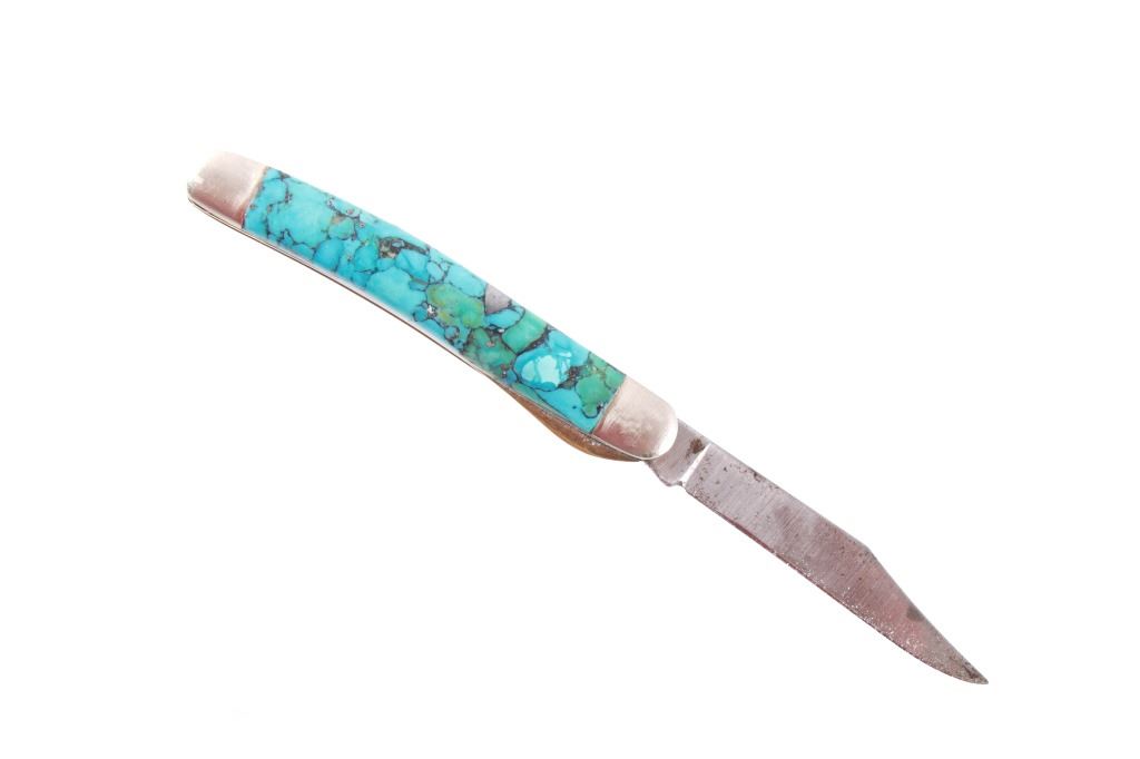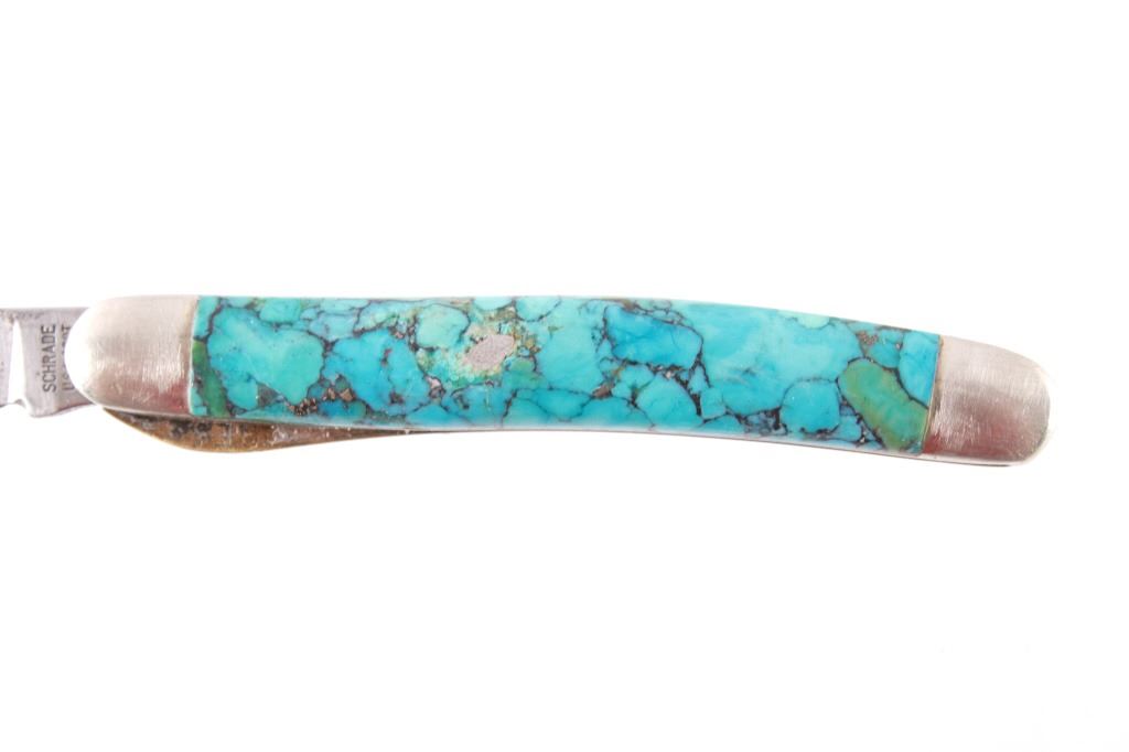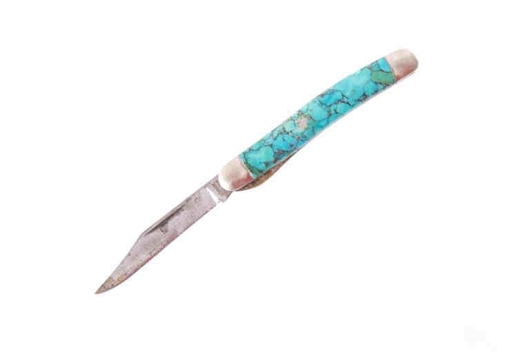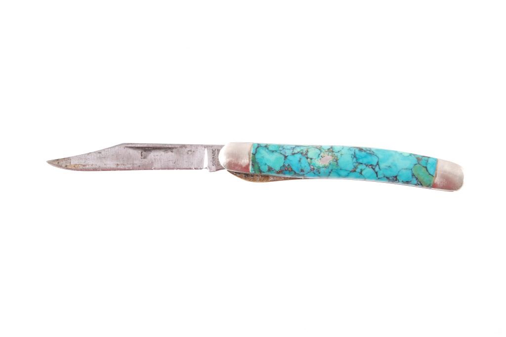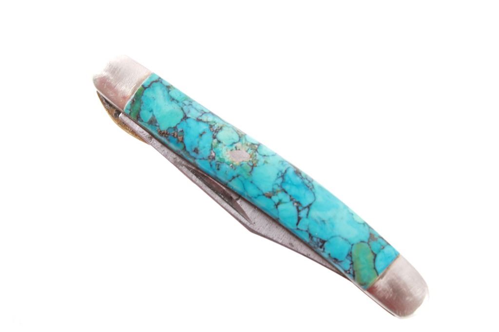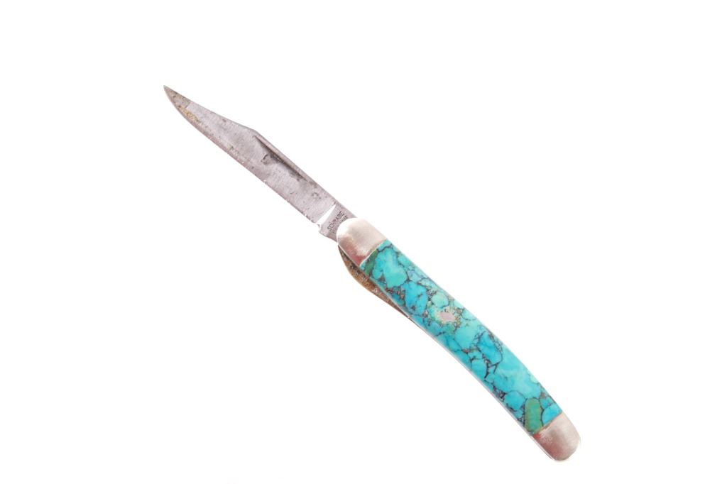 Featured in this lot is this Navajo number 8 turquoise folding Schrade knife. This knife features a wonderfully and professionally crafted folding knife that shows handle panels constructed from polished number 8 turquoise and shows a mark of for the knife making company Schrade an sis marked 'U.S.A 18OT.' The condition of this lot is good with no obvious signs of damage and in good overall condition. The measurements of this knife unfolded are 2 3/4" x 1/2" x 1/2" and the unfolded length is 4 3/4".