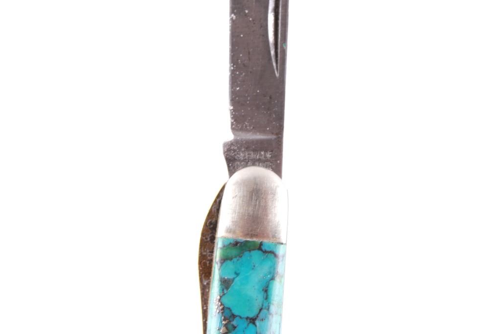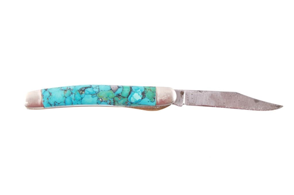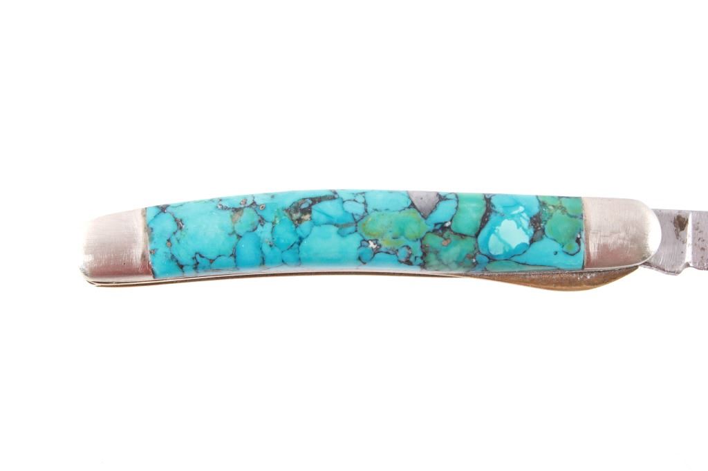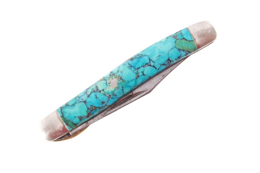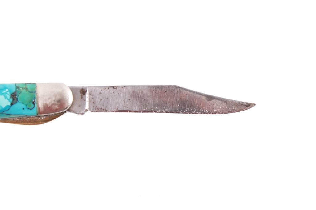 Featured in this lot is this Navajo number 8 turquoise folding Schrade knife. This knife features a wonderfully and professionally crafted folding knife that shows handle panels constructed from polished number 8 turquoise and shows a mark of for the knife making company Schrade an sis marked 'U.S.A 18OT.' The condition of this lot is good with no obvious signs of damage and in good overall condition. The measurements of this knife unfolded are 2 3/4" x 1/2" x 1/2" and the unfolded length is 4 3/4".