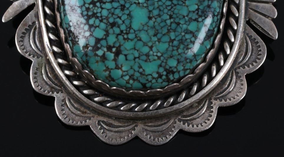 Included in this lot is a set of stunning B. Yazzie Navajo Native American Spiderweb Number 8 turquoise sterling silver earrings. These early 1900’s earrings show a gorgeous gray patina and clip on design. The earrings feature an exemplary pair of Spiderweb Number 8 turquoise polished gemstones. The gemstones are surrounded a detailed silver braided rope design and hand stamped boarder. The earrings measure 1 7/8” x 1 ½”.