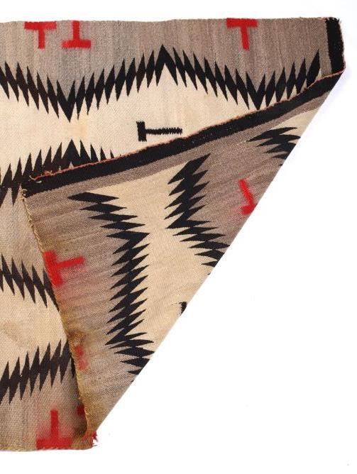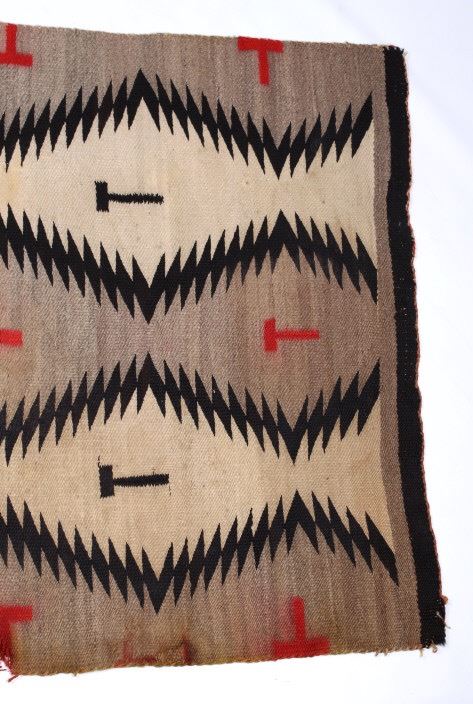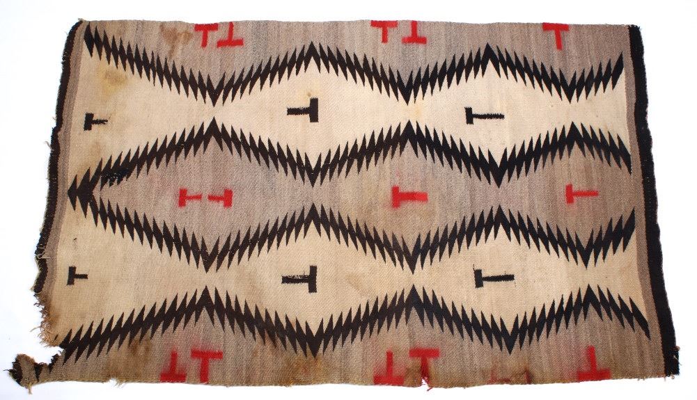The lot features an original Navajo Old Crystal Trading Post “Eye Dazzler” rug from the early 1900’s. The rug has an excellent eye dazzler design in grey, tan and dark brown with repeating “T” like symbols in dark brown and red. Originally the Old Crystal trading post was established in 1894, in this remote part of the Navajo Reservation Southwest of Two Grey Hills and Northwest of Gallup. In 1896 J.B. Moore purchased an interest in the trading post and re-named it Crystal after a pure sparkling mountain spring that was in the area. Due to the remoteness of the Trading Post he started using a mail order catalog to sell his rugs to the Eastern market. The first catalog came out in 1903, with another in 1911. He left the reservation in 1911. During his stay at Crystal he greatly influenced the change in styles of Navajo rugs being produced at the Crystal Trading Post. The rug measures 63 1/2" long by 40" wide.