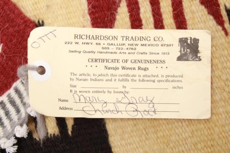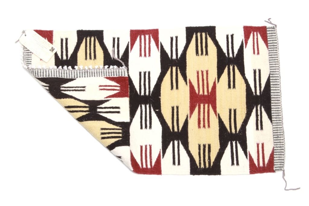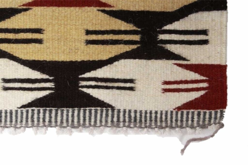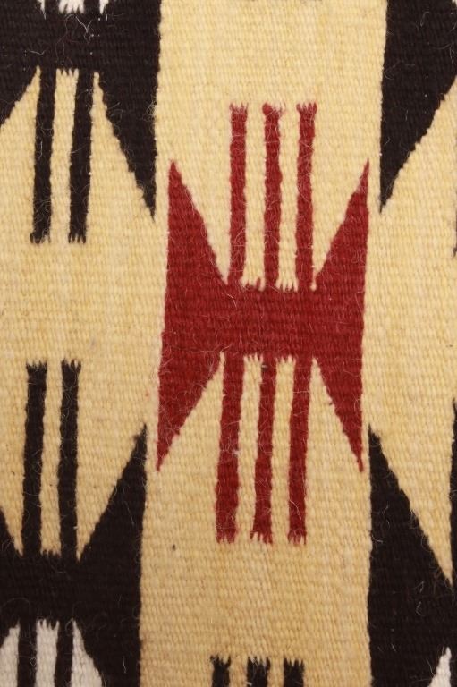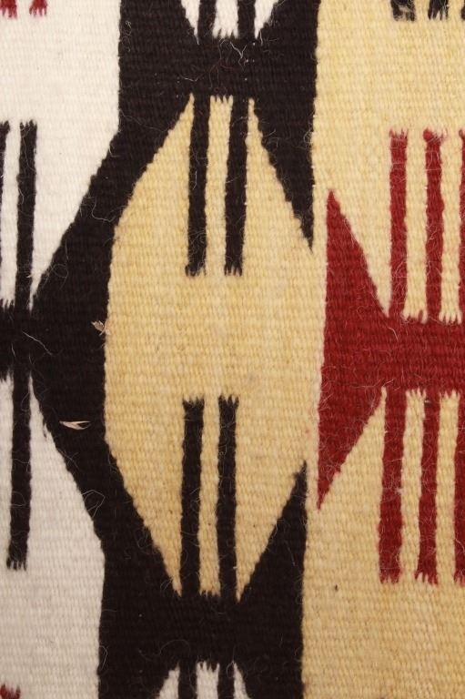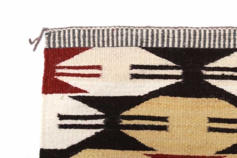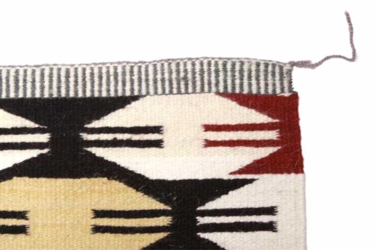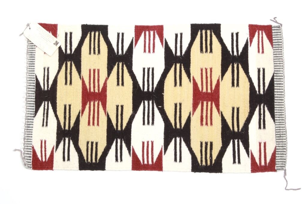 Featured in this lot is this Navajo Chinle Gallup trading post wool rug, circa 1950's. The rug features a beautifully and wonderfully constructed Gallup trading post old crystal construction; the rug shows old crystal design with stepped medallions of yellow, white, black, and red naturally dyed coloration. The Old Crystal trading post was established in 1894, in a remote part of the Navajo Reservation southwest of Two Grey Hills and northwest of Gallup, NM. In 1896\, J.B. Moore purchased an interest in the trading post and re-named it Crystal after a pure sparkling mountain spring that was in the area. Due to the remoteness of the Trading Post, he started using a mail order catalog to sell his rugs to the eastern market. The first catalog came out in 1903, with another in 1911. He left the reservation in 1911. During his stay at Crystal, he greatly influenced the change in styles of Navajo rugs being produced at the Crystal Trading Post. The condition of this rug is good, with no obvious signs of damage. The measurements of this rug are 33" x 19".