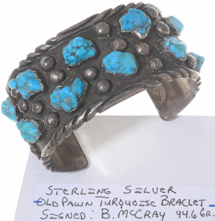 Sterling Silver Bracelet decorated with (10) natural turquoise stones. Signed "B. McCray" on the inside. 94.6GR heavy older design with 7"length and 1 5/8"gap.