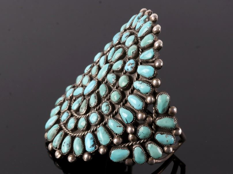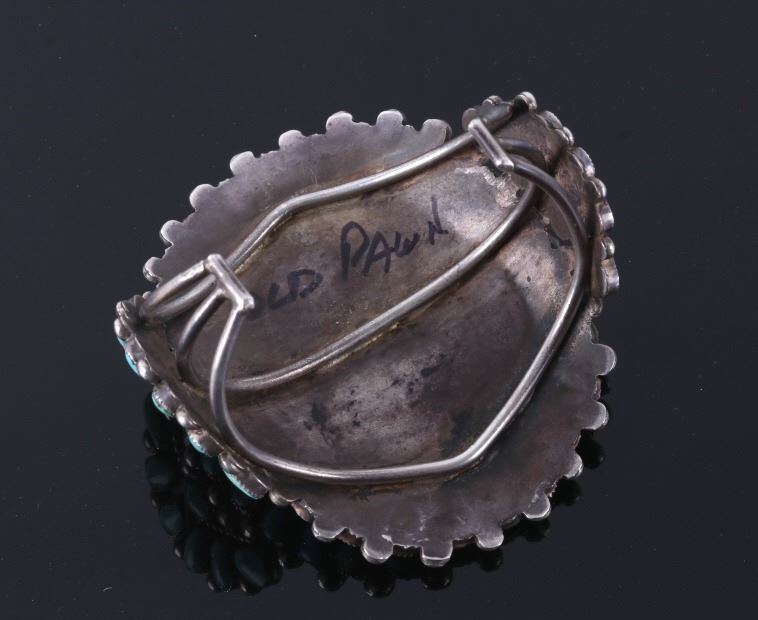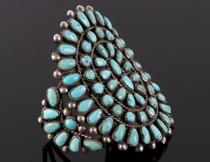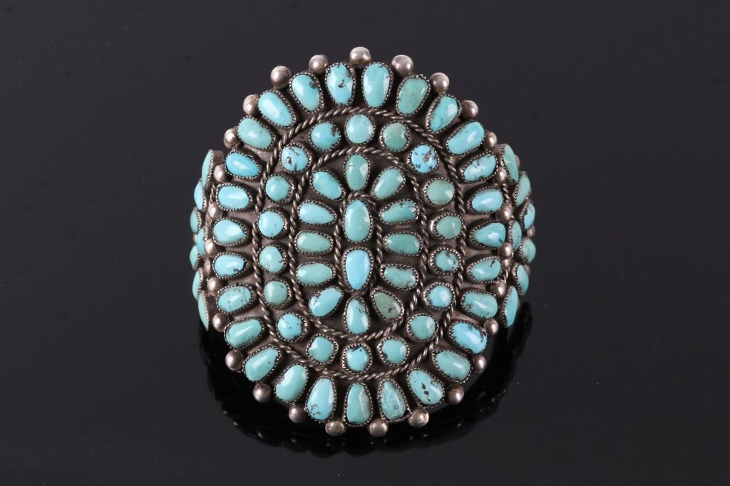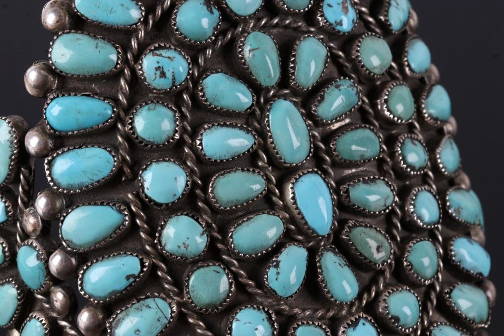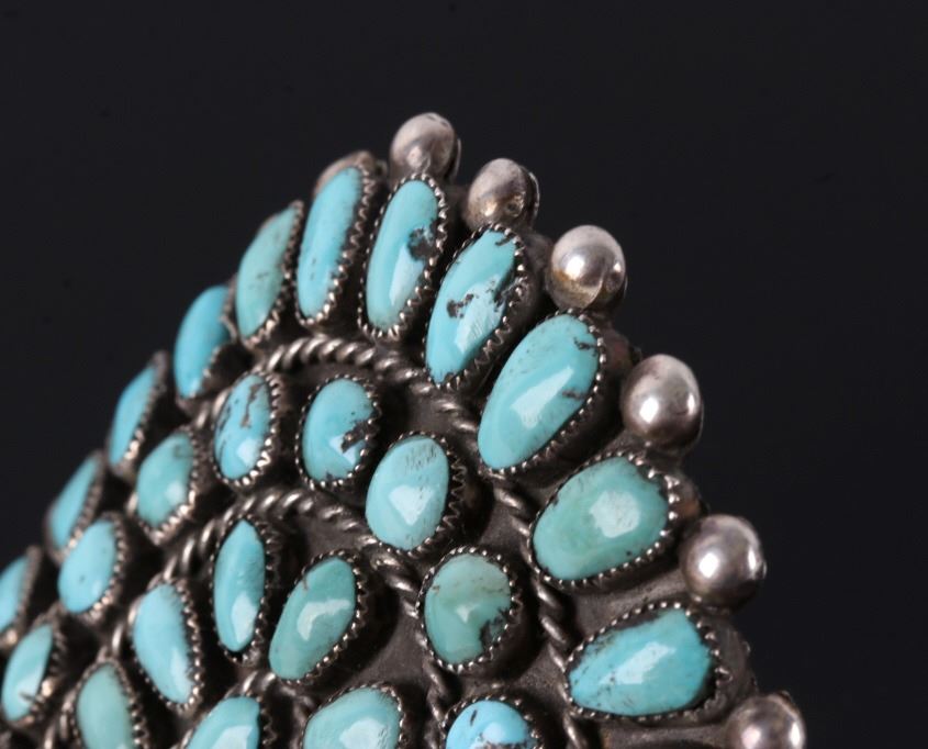 For your consideration is an excellent example of an old pawn Navajo Native American Indian Petit Point Sleeping Beauty turquoise and silver bracelet. The piece has a large 3.5” size with round top medallion and side accents on three strands of the silver bracelet. The piece shows wonderful Sleeping Beauty turquoise, silver bead accents and excellent craftsmanship. On the reverse the piece shows a well-worn patina. The Old Pawn Silver bracelet shows good condition. Measures: 3.5" x 2" H x 3.25".