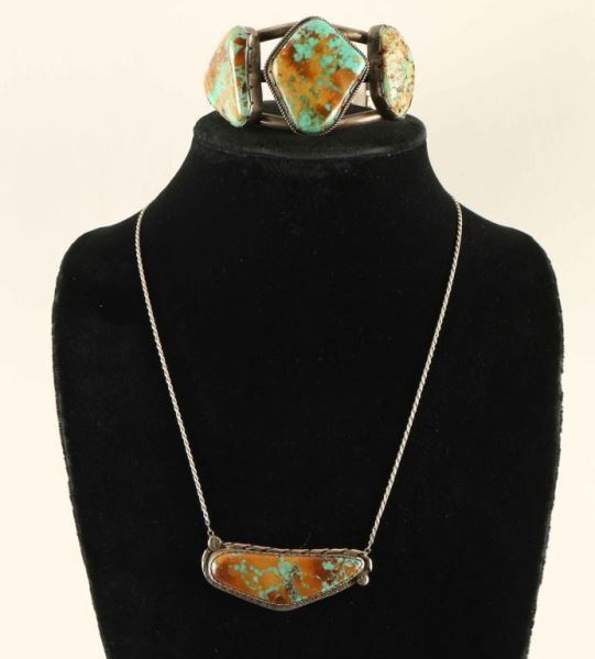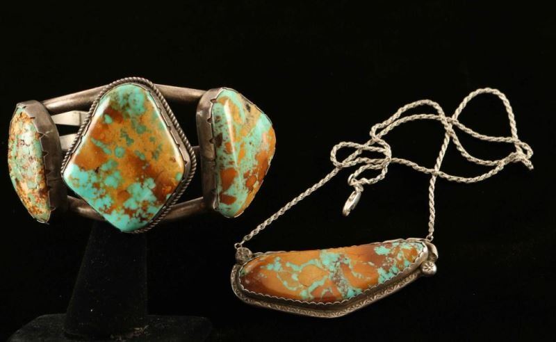 Three large blue green and brown turquoise stones set in sterling silver, and a 2 1/4" long piece of the same turquoise set in a scallop and floral motif of silver on an Italian silver rope chain. Both are marked 'DD' and 'Sterling'.