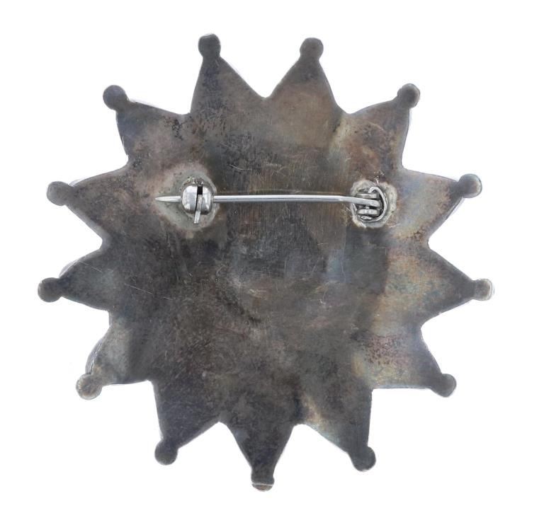 Featured in this lot is this Navajo Old Pawn sterling silver and Number 8 turquoise pin or brooch circa 1950's. The pin features a wonderfully and professionally crafted sterling silver and Number 8 turquoise construction. The pin features 21 total round and pear cut Number 8 turquoise cabochon that shows good light blue to dark blue luster with great coloration to the stones. The condition of this pin is good with no obvious signs of damage and shows good overall condition. The measurements of this pin are 2" x 2" x 1/4". The collective weight of this pin are 16.8g.