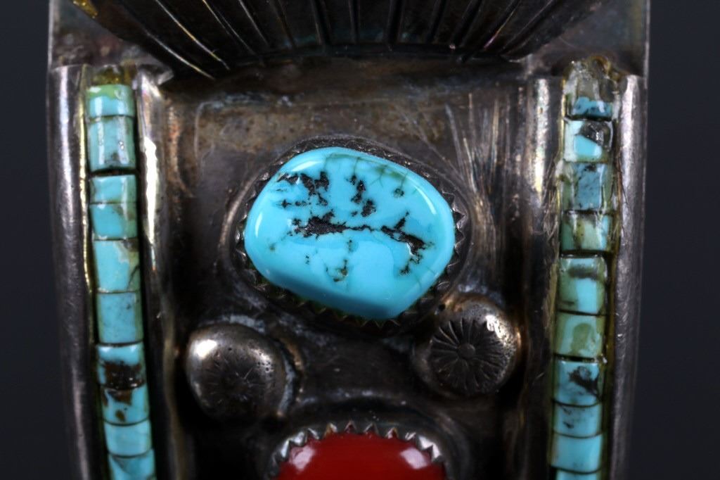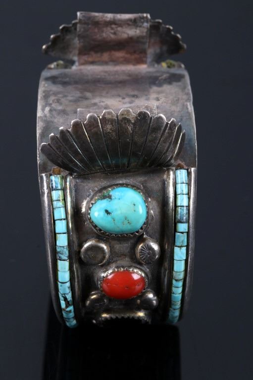 Featured in this lot we have a Navajo Native American sterling silver old pawn Royston Turquoise bracelet. The bracelet displays sterling silver construction with inlayed designs and a section to sit a watch. Each sides of the bracelet displays a turquoise, ox blood coral, and onyx cabochons with a line of turquoise inlayed along the border. The sides show six tooled silver droplets set between the cabochons. The bracelet is marked across the bottom reading "WT Sterling". The piece shows good condition overall with a warm patina across the bracelet. The bracelets interior circumference of 7" and measuring 1 3/8" wide.