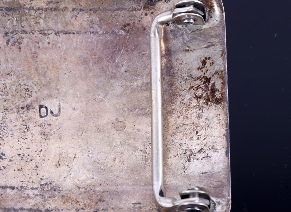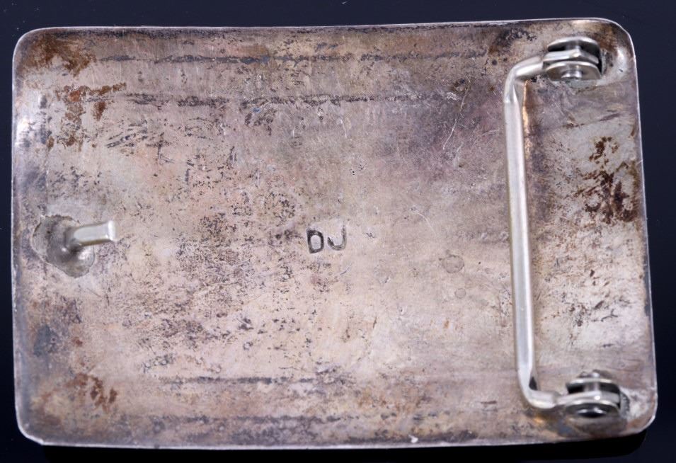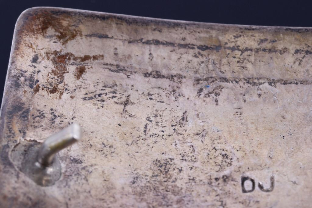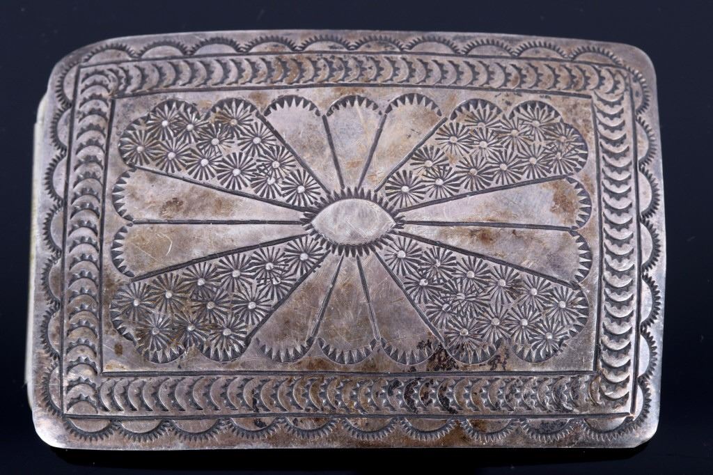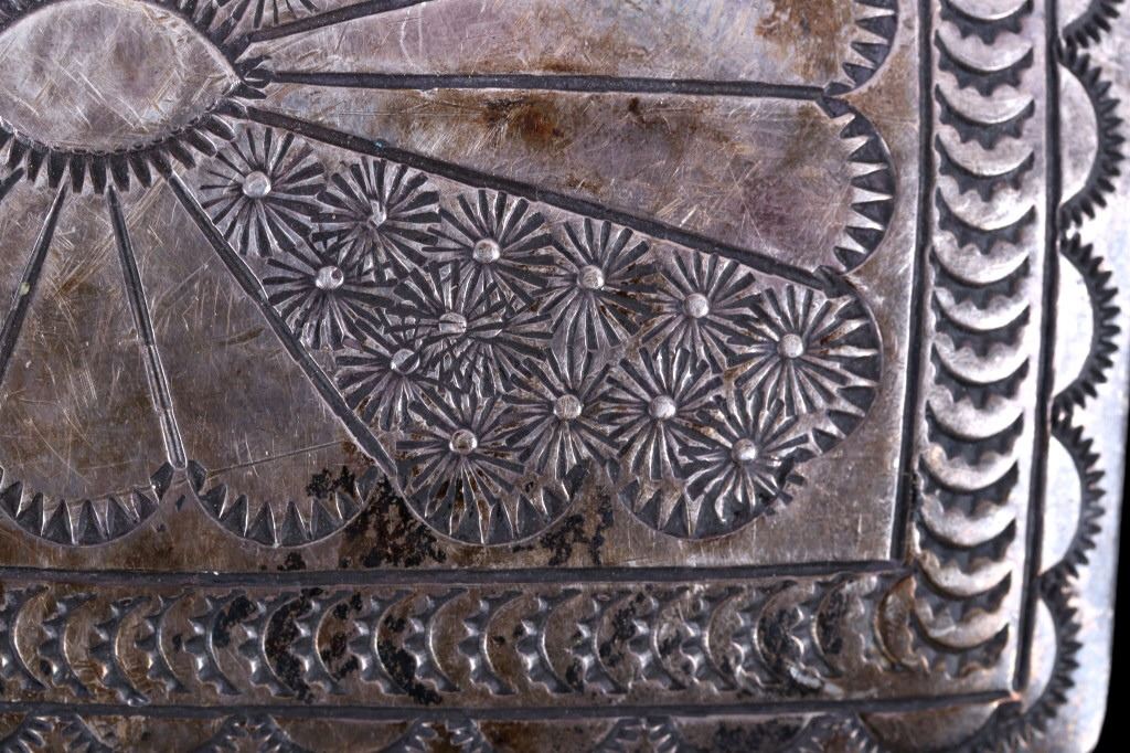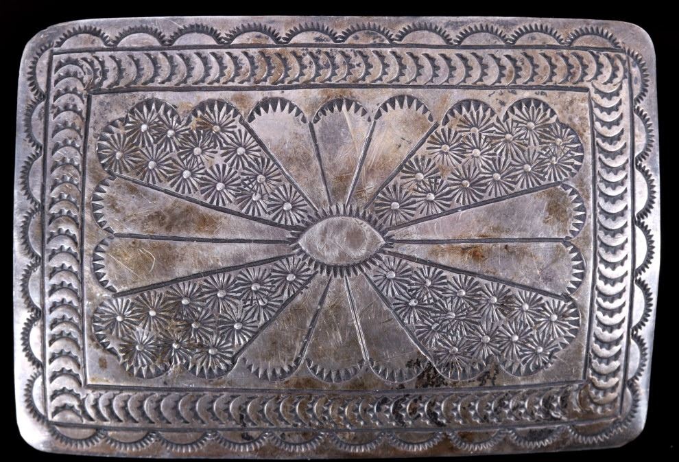 Included in this lot is a Navajo Native American Old Pawn Sterling Silver belt buckle dating to the 1920's. This stunning piece of craftsmanship shows a detailed western design stamped into the sterling silver. The buckle is stamped with the artists hallmark on the back "DJ" attesting to the silvers purity. The buckle measures 3" x 2 1/8".