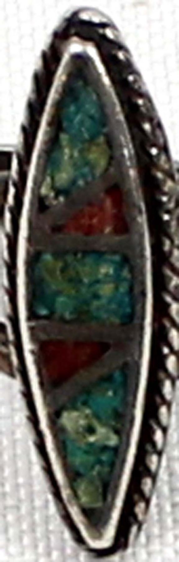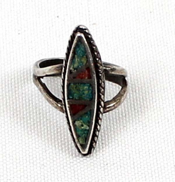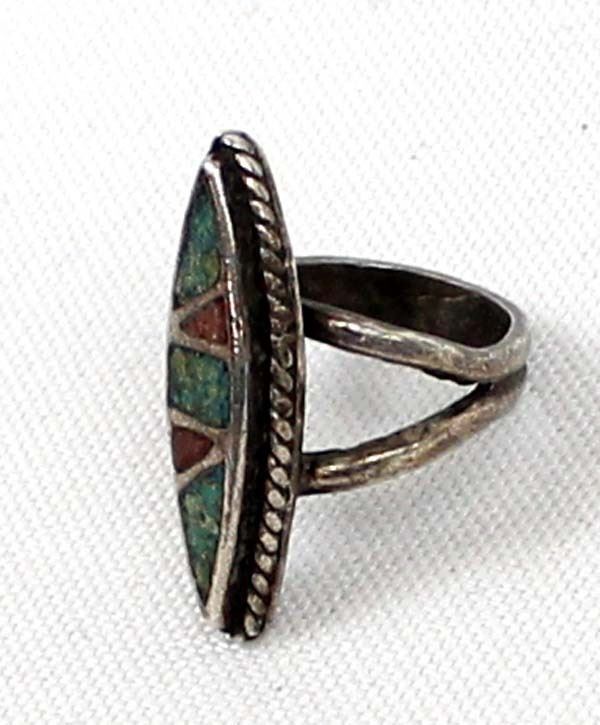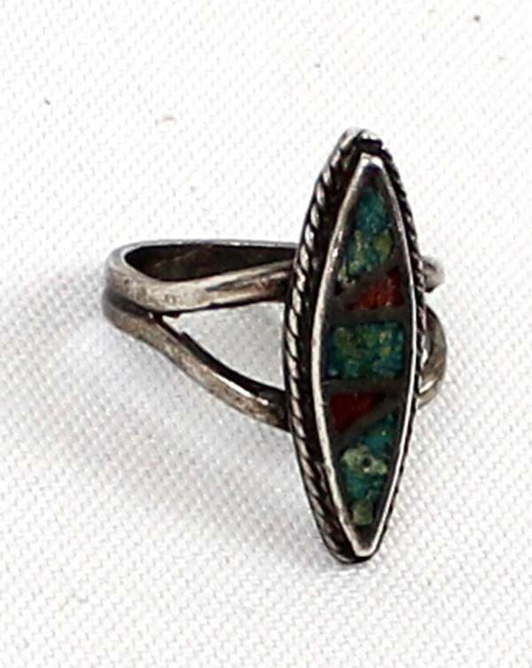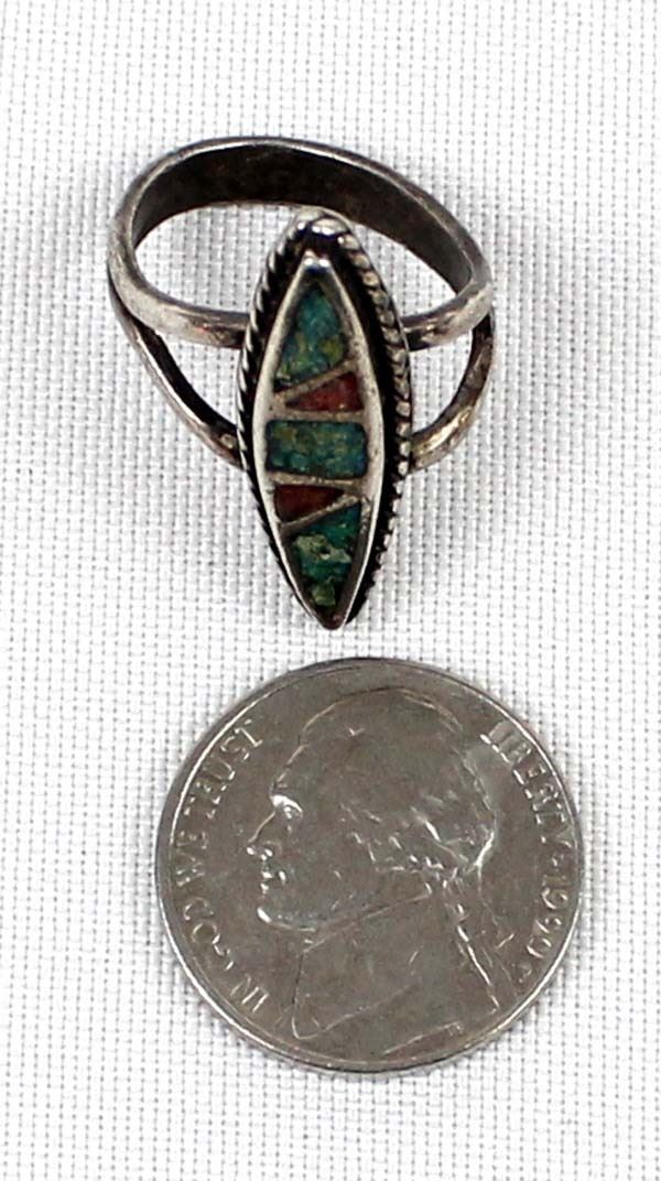 Native American Navajo Old Pawn Sterling Turquoise & Coral Chip Inlay Ring, Size 4.5, measures 4.5''