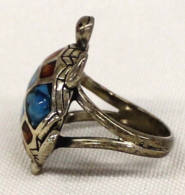 Native American Navajo Old Pawn Sterling Chip Inlay Turtle Ring, measures 1'' x .75''