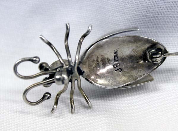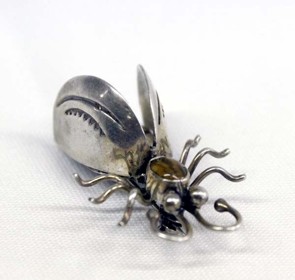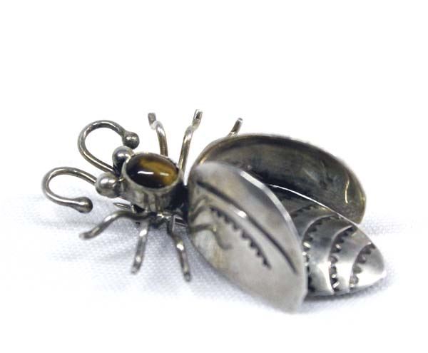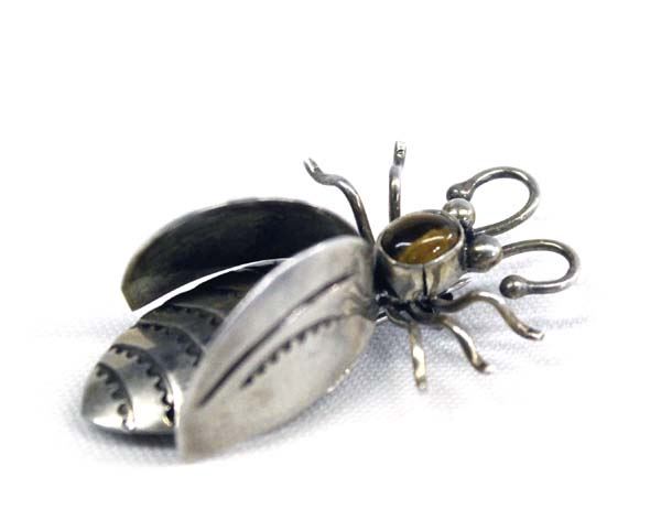 Navajo Old Pawn Sterling Tiger Eye Winged Insect Pin by Juan Begay Jr., stamped sterling and hallmarked JB, measures 1.25''L x 1''W, weighs 7.2g