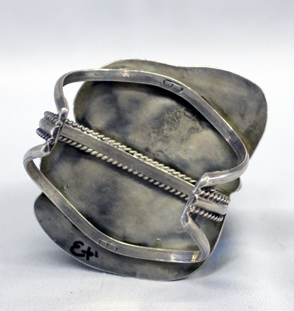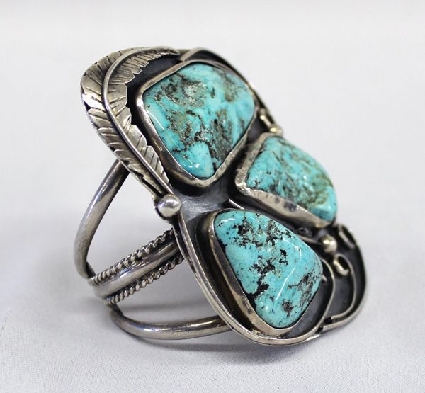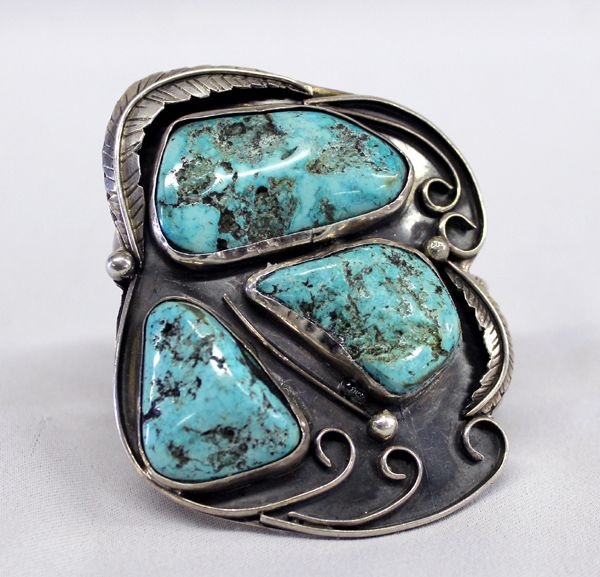 Native American Navajo Old Pawn Sterling & Turquoise Bracelet. Bold and dramatically designed piece of old pawn sterling silver and turquoise. The bracelet has a large silver platform to accomodate 3 large polished turquoise nuggets with silver leaves and beads. The bracelet measures 6 1/2, including opening. The largest nugget measures 1 3/4'' x 1'' with the platform of the bracelet measuring 3'' x 2 3/4''. Dramatic and bold!