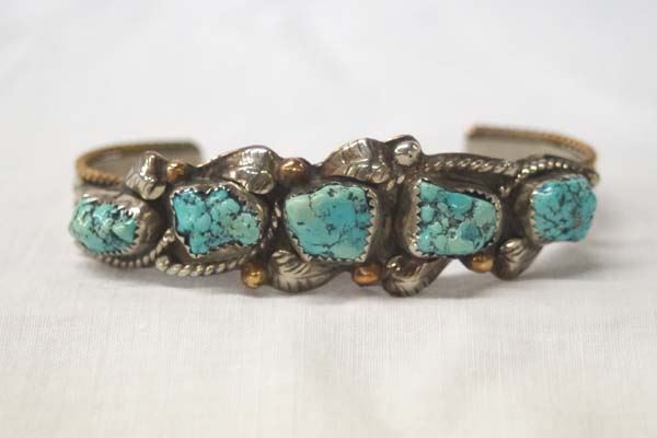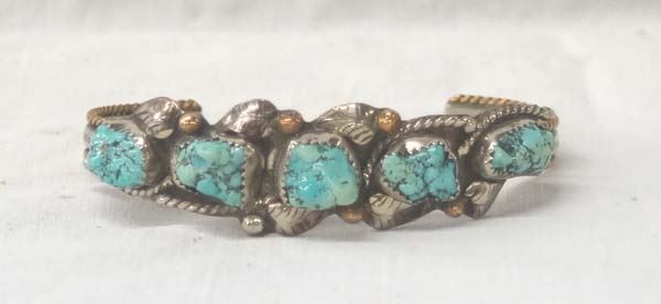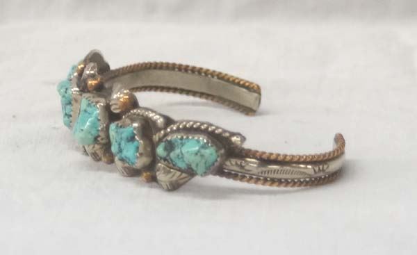 Native American Navajo Old Pawn Sterling Turquoise Bracelet, older piece of Native American jewelry, 1970's with copper accent beads, set with turquoise nugget cabochons, inside measures 7'' which includes opening x 1.5''W, 27.99g in total wt.