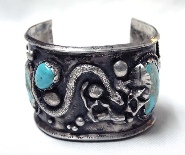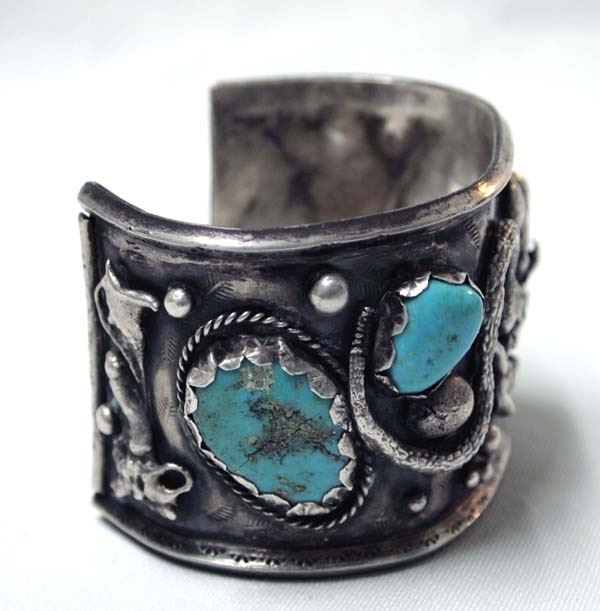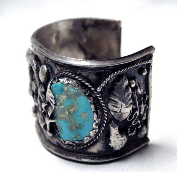 Big and Bold Native American Navajo Old Pawn Sterling Turquoise Cuff Bracelet, inside measures 7 1/8'' which includes the opening x 2''W, largest turquoise cab measures 1.25'' x .75'', over 100g in total wt.