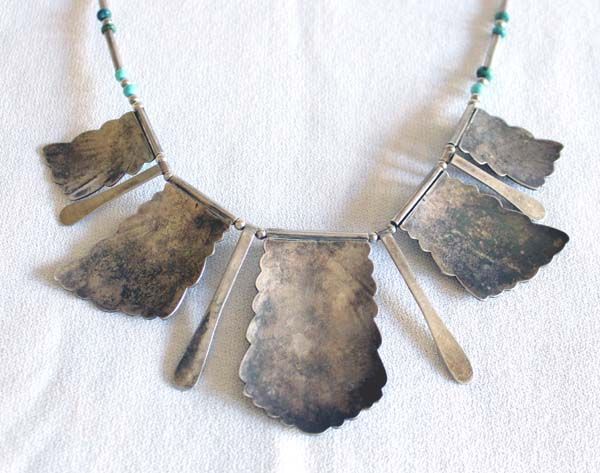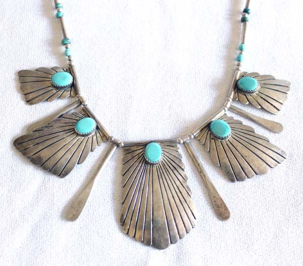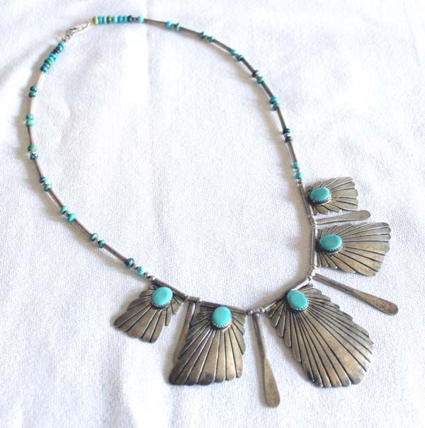 Navajo Old Pawn Sterling Turquoise Necklace, measures 22'' end to end with center pendant measuring 2'' x 1.25'', all sterling silver set with 5 sky blue oval turquoise cabochons (measuring .25'' x 3/8''), has been restrung with sterling silver clasp, carved linear accents lines on each panel and scalloped edging, sterling and turquoise beads, 56.28g in total wt, gorgeous piece!