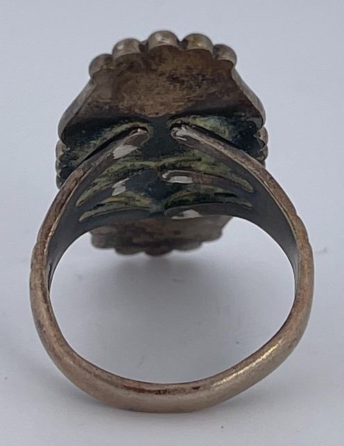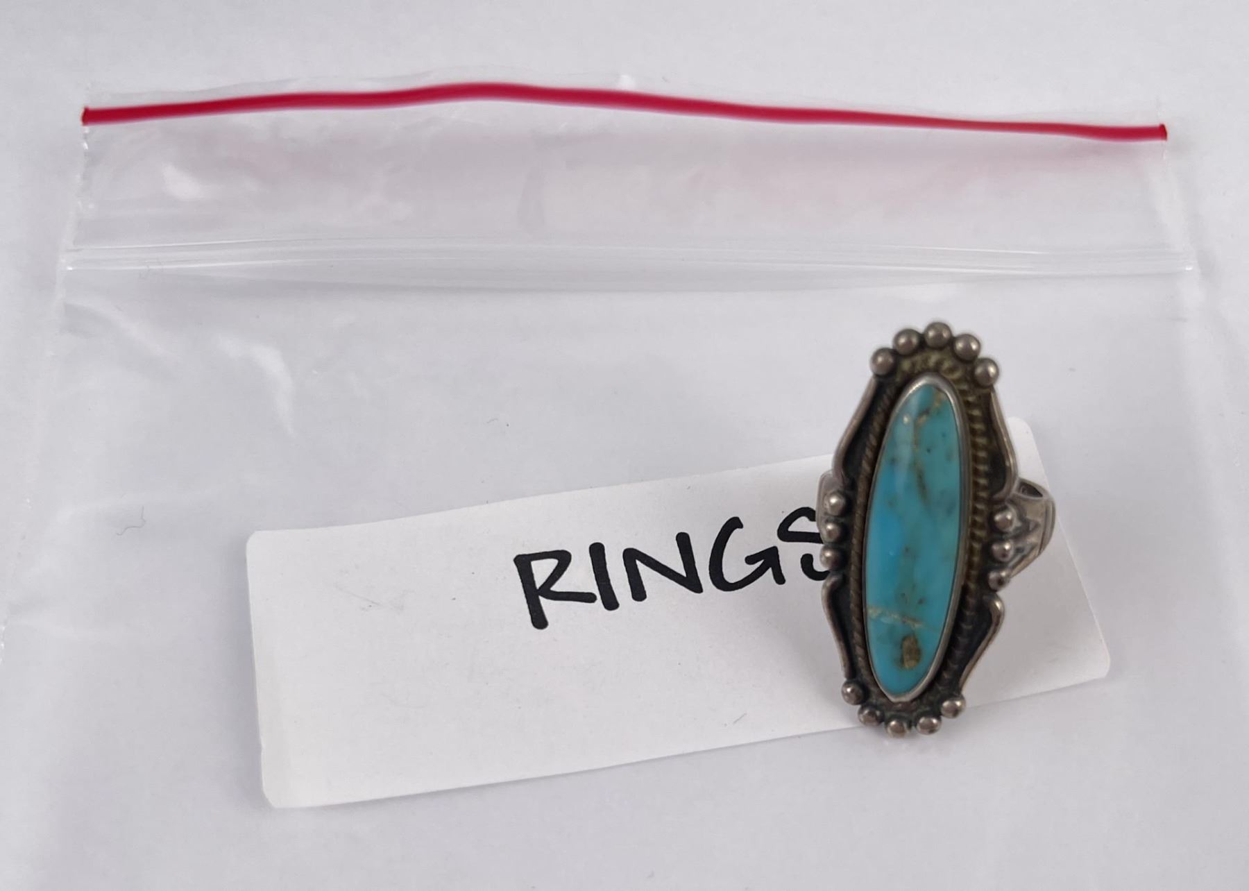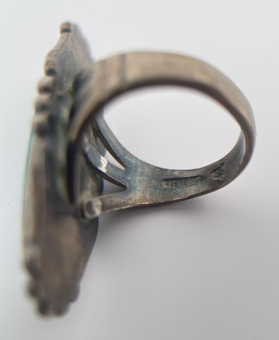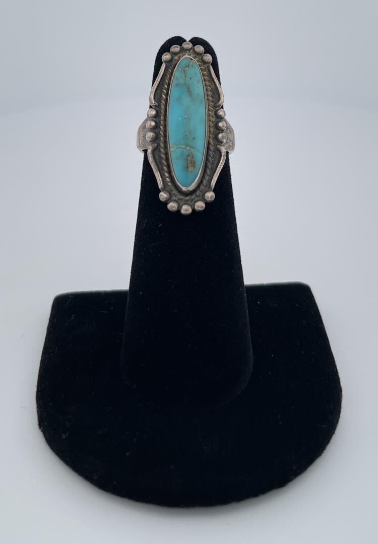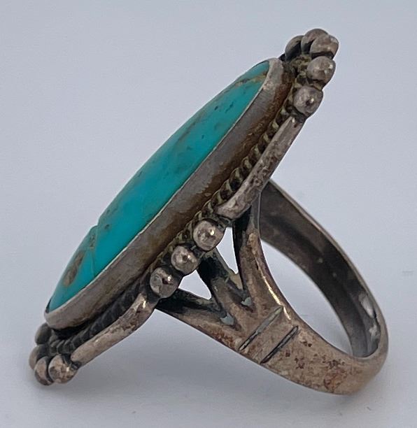 Very nice oblong shaped turquoise cab nicely set in Sterling Silver. Stamped with makers mark. Size 4.25