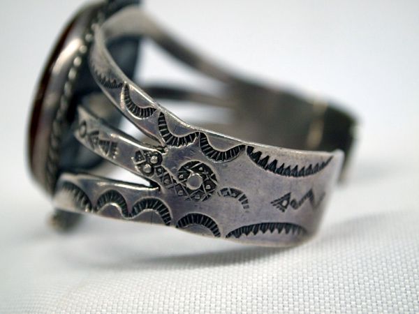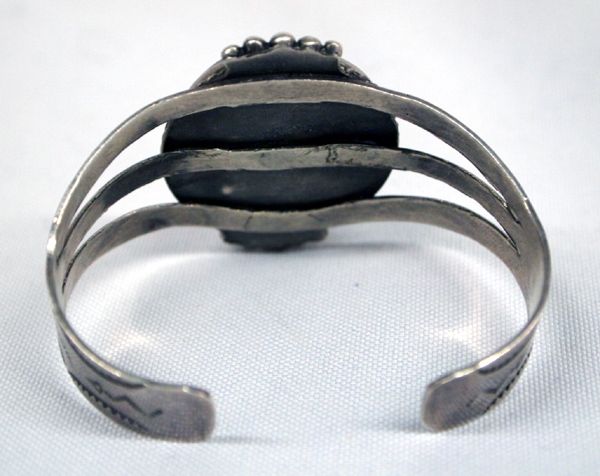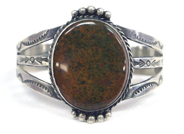 Navajo Old Pawn Trading Post Sterling Unikite Bracelet, gorgeous brown Unikite cabochon 1 3/8'' x 1 1/8'' set in traditional setting accented with silver beadwork, hand stamped 3 wire band which tapers down into one band, stamped sterling, 6.25'' inside measurement which includes opening x 1.75''W, stunning older piece