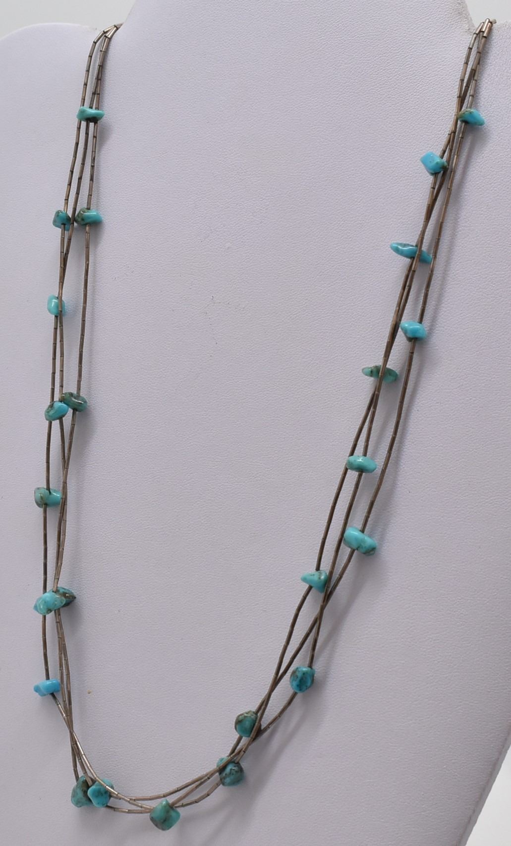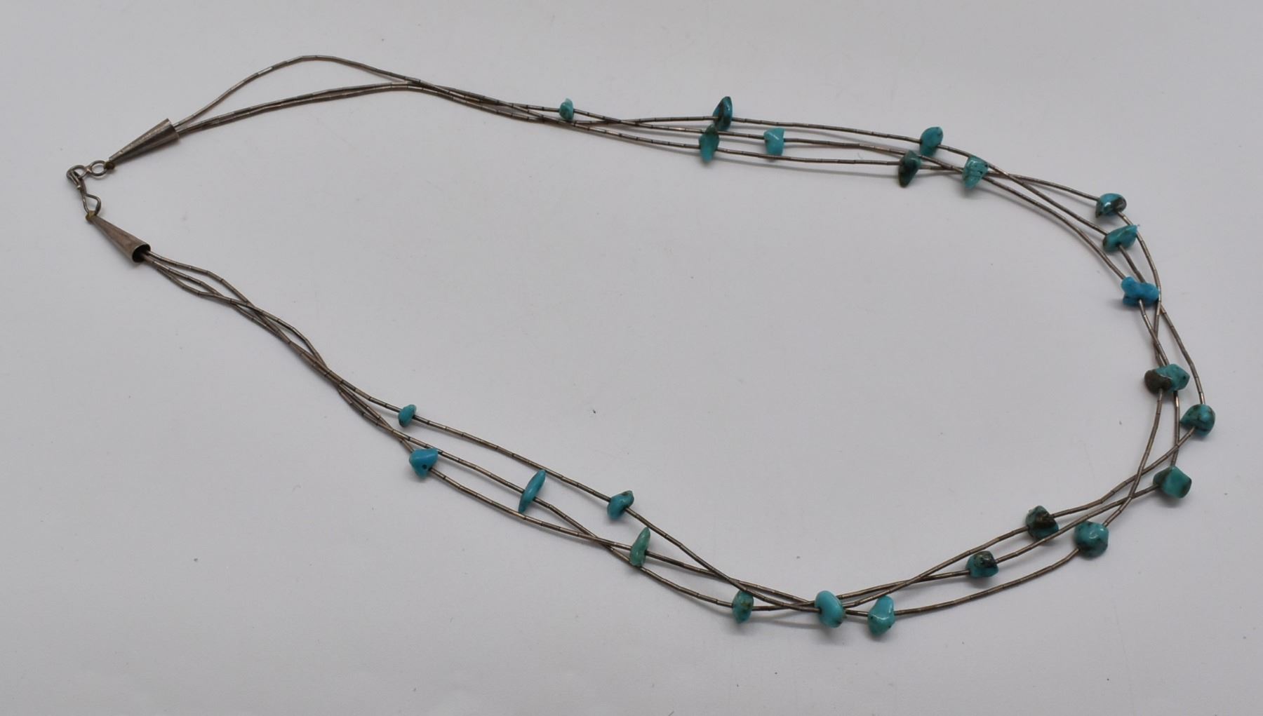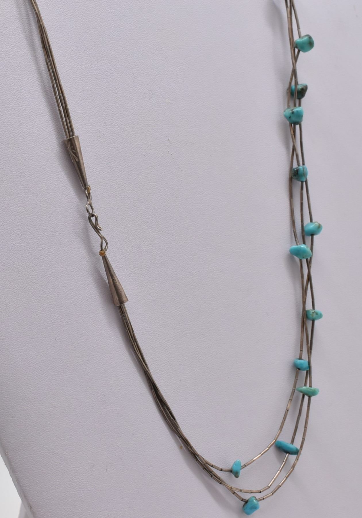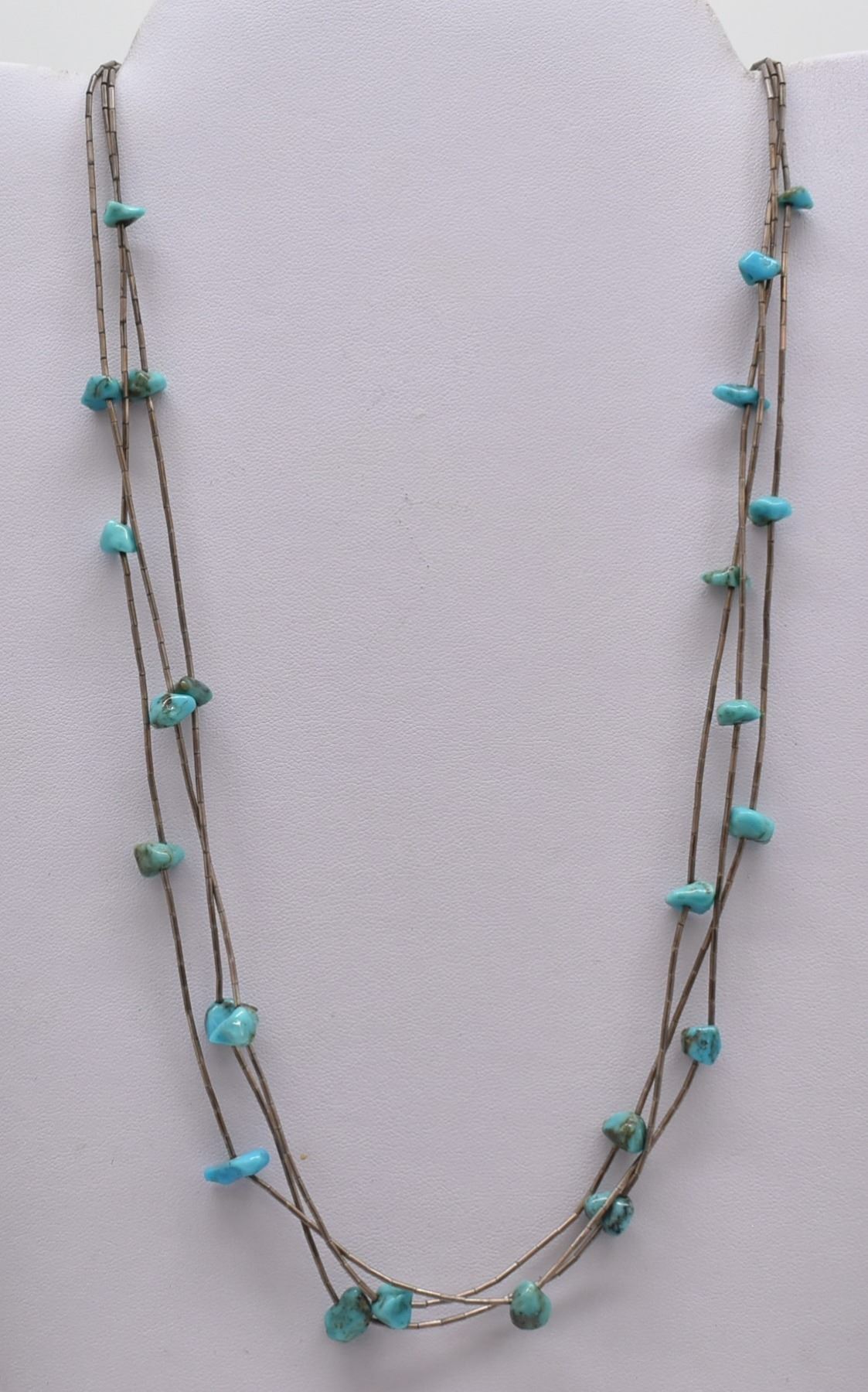 Native American Navajo Old Pawn Triple Strand Turquoise Nugget Necklace, features liquid silver beads and beautiful polished Royston Turquoise nuggets ranging in size from 5 to 8mm, sterling silver cones complete the necklace with a hook and eye closure, necklace measures 26''L end to end