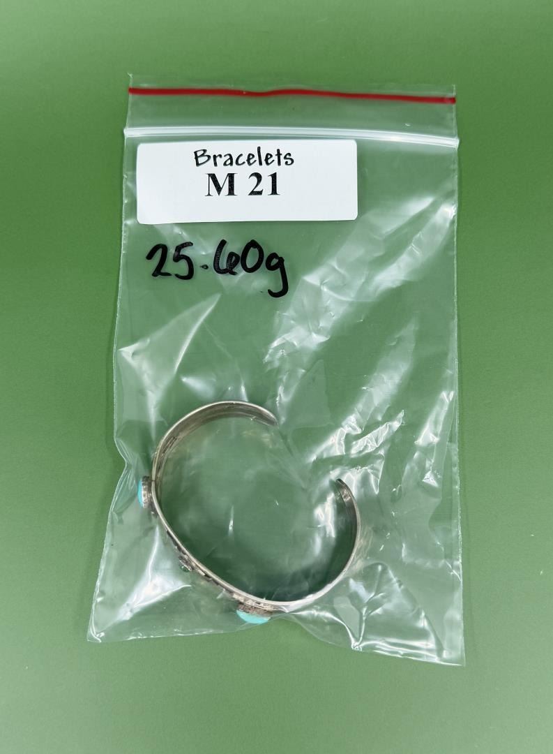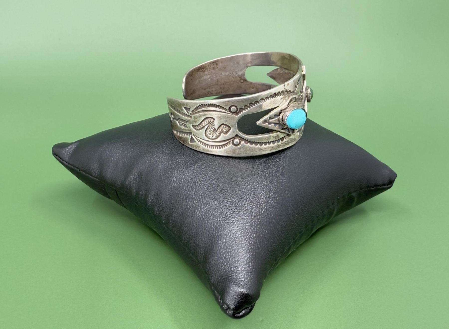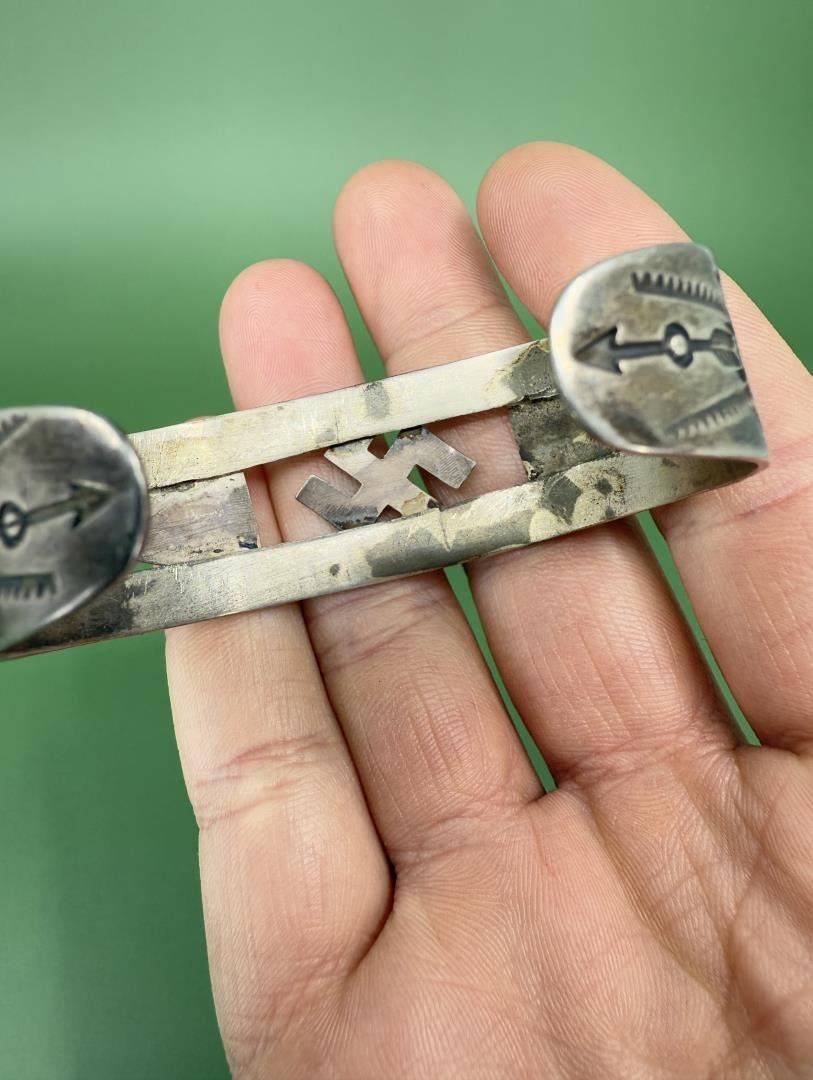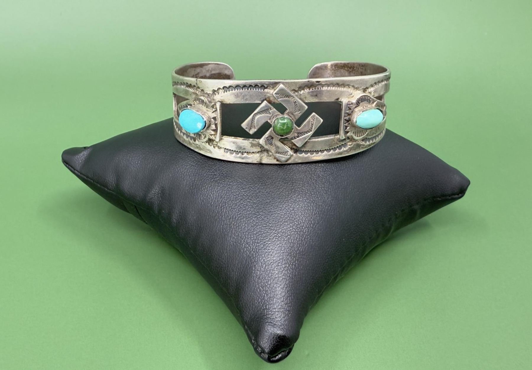 Swastika or Whirling Log Pattern, set with turquoise. Wonderful old bracelet. 2 3/8" by 1 3/4" by 7/8". 25.6 grams