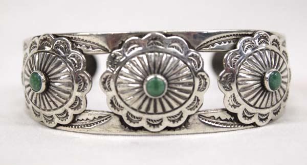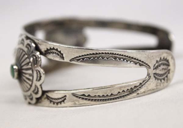 Native American Navajo Old Revival Style Silver Turquoise Bracelet, inside measures 6.25'' which includes opening x .75''W, great looking sterling silver bracelet with green turquoise, hand crafted revival style silver, stamped sterling, 17.87g in total wt.